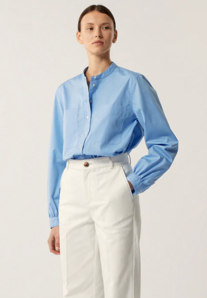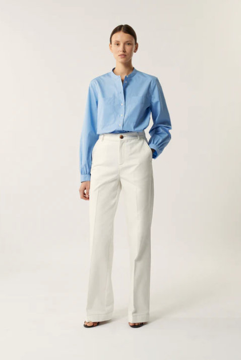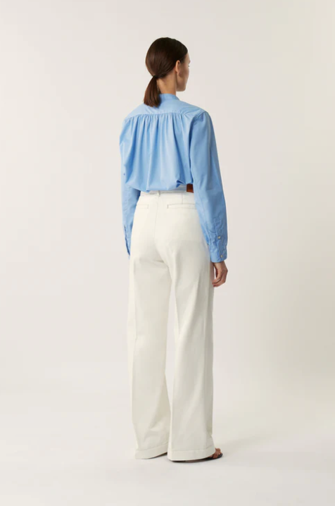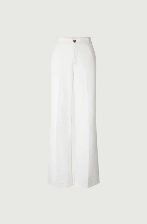 Jean California en denim blanc. Coupe ajustée en haut et large évasée en bas. Poches italiennes devant, deux poches au dos. Pli marqué le long de la jambe.
