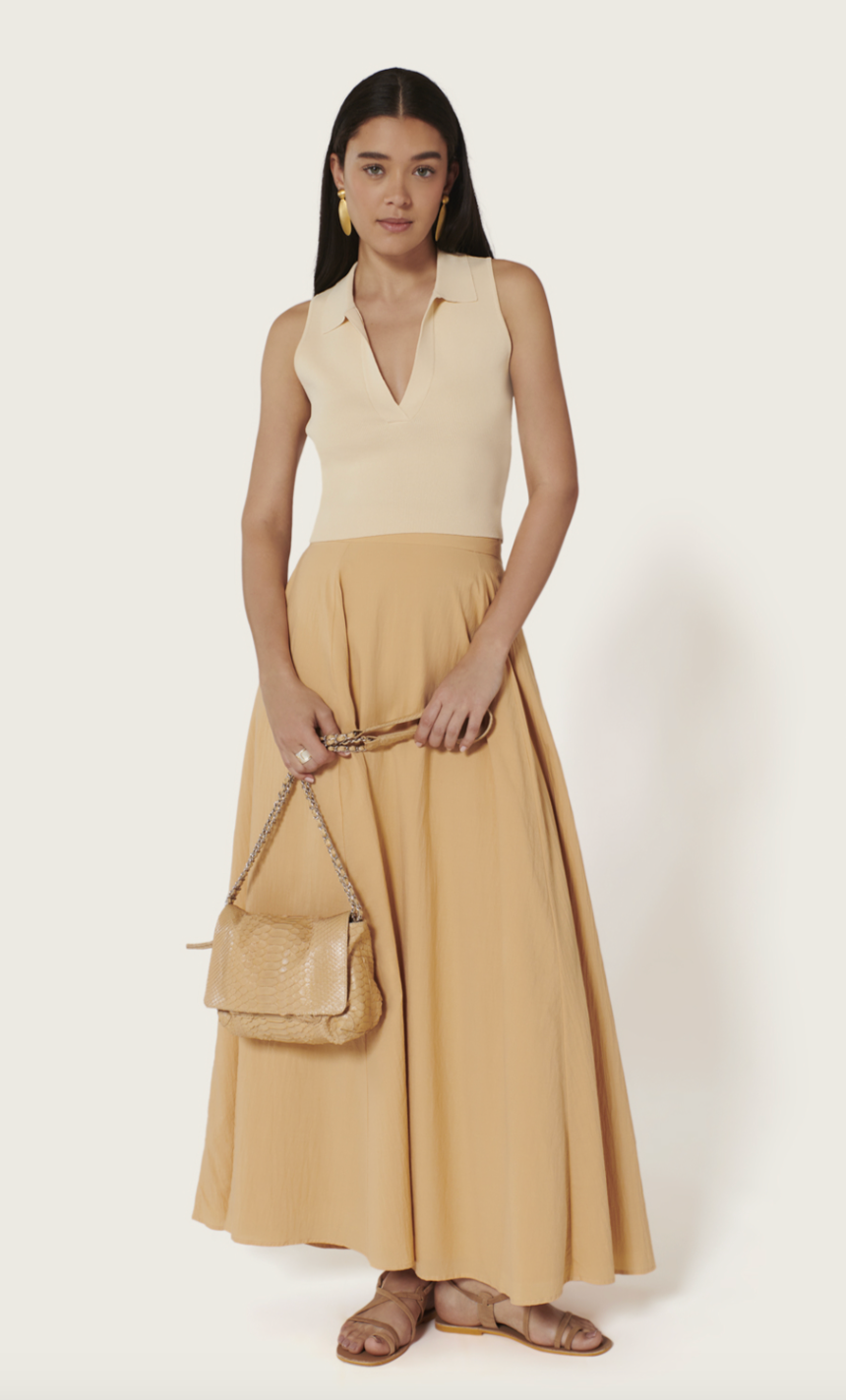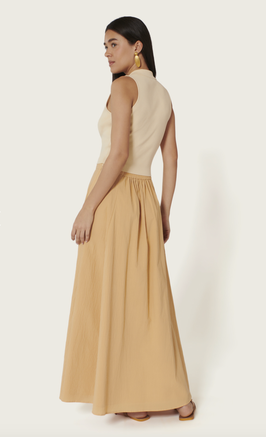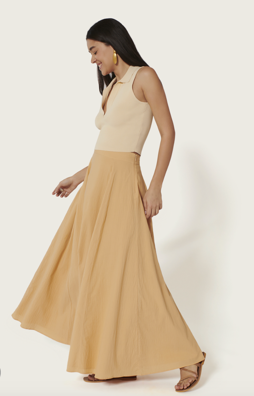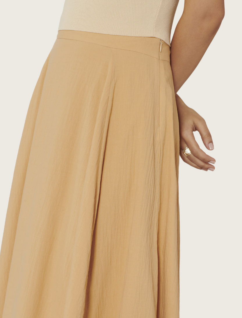 Jupe longue Nina champagne rosé en coton brossé, coupe maxi jupon et volume généreux. Ceinture à la taille avec un empiècement élastiqué froncé à l'arrière. Godets intégrés aux coutures à l'avant et à l'arrière.