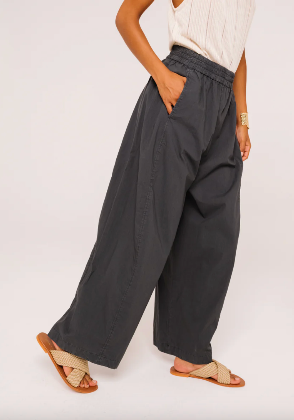 Pantalon coupe barrel oversize en popeline de coton. Taille élastique pour plus de confort, surpiquée devant et au dos. Poches discrètes dans la couture.