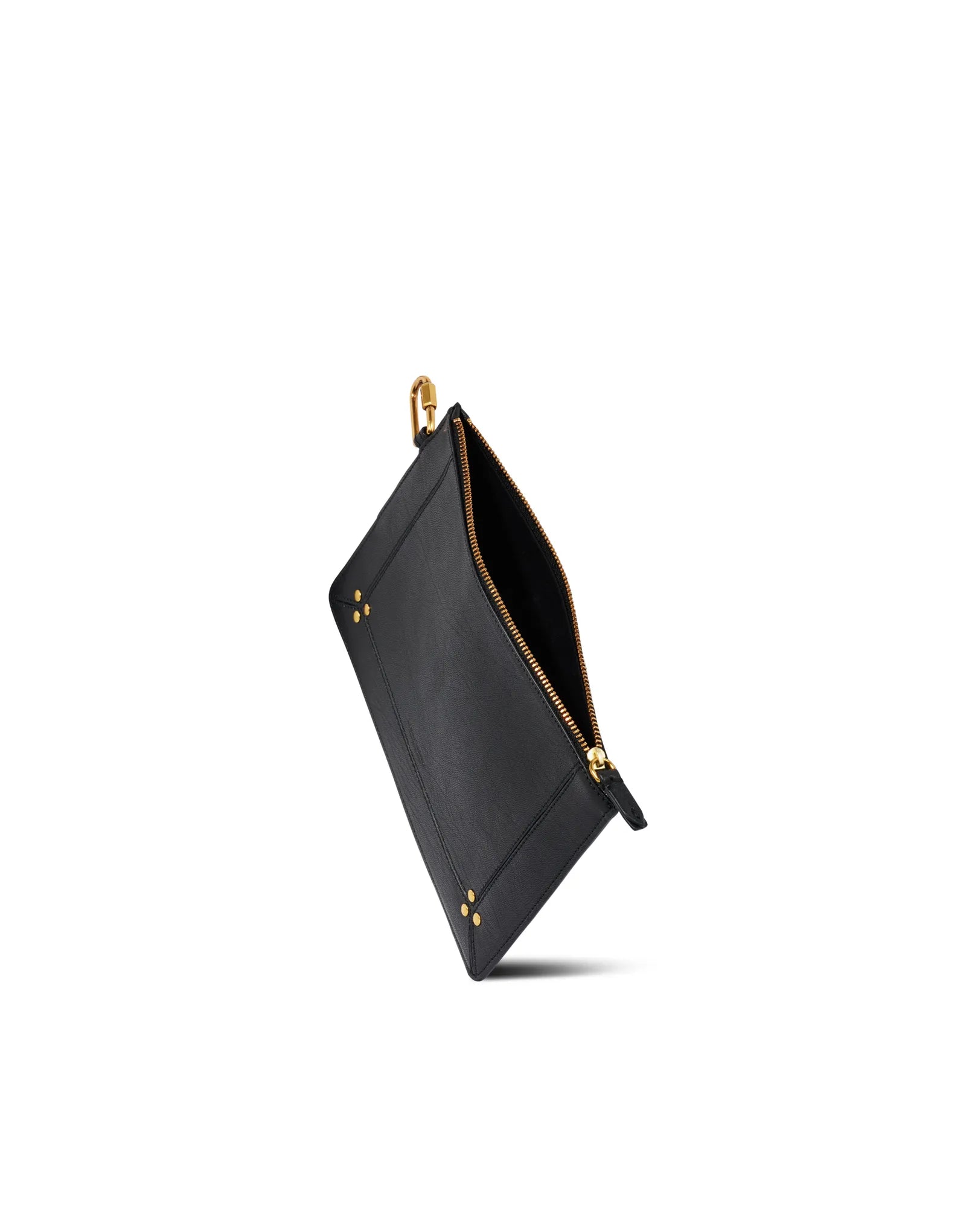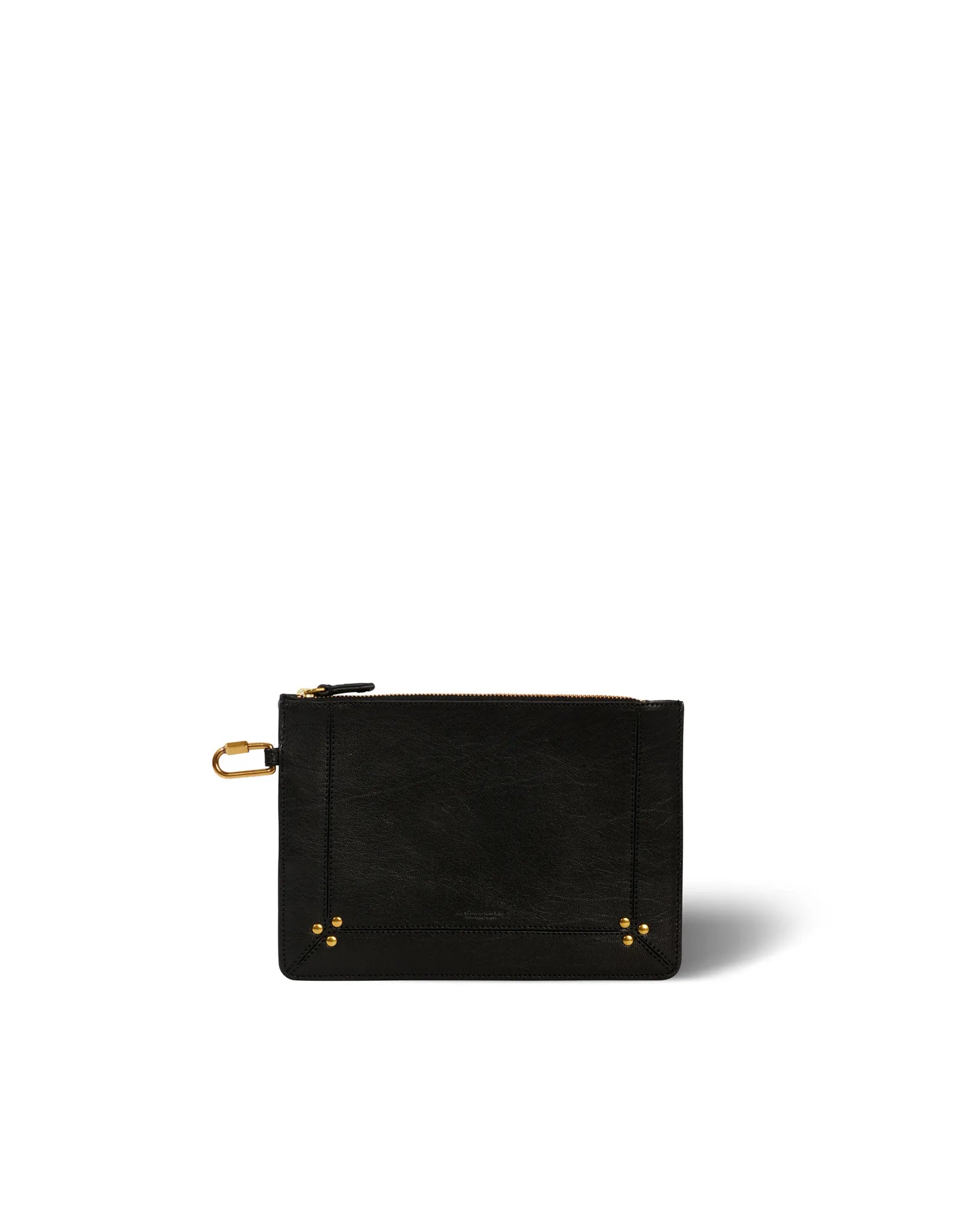 Pochette en cuir noir avec une fermeture à zip avec un anneau pour l’accrocher au mousqueton présent dans les sacs de Jérôme Dreyfuss.