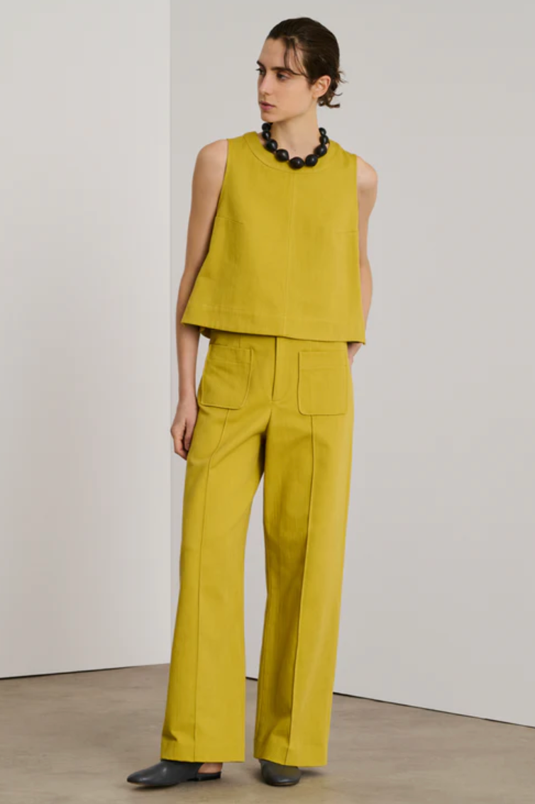 Le Top Pampa est un top court sans manches réalisé dans une toile de coton texturée bleu cyclade. Sa coupe trapèze, son encolure ronde et son ouverture zippée invisible au dos en font une pièce à la fois élégante et confortable. Les surpiqûres ajoutent une touche de finition délicate. Ce top est conçu dans une toile de coton épaisse mais respirante, parfaite pour la mi-saison, offrant une texture unique qui structure le vêtement.