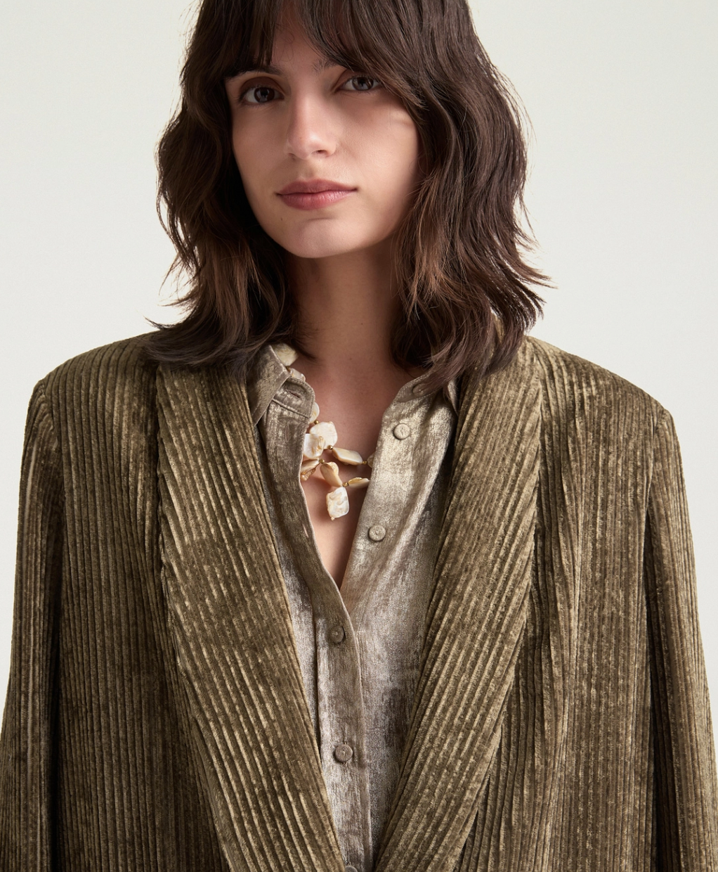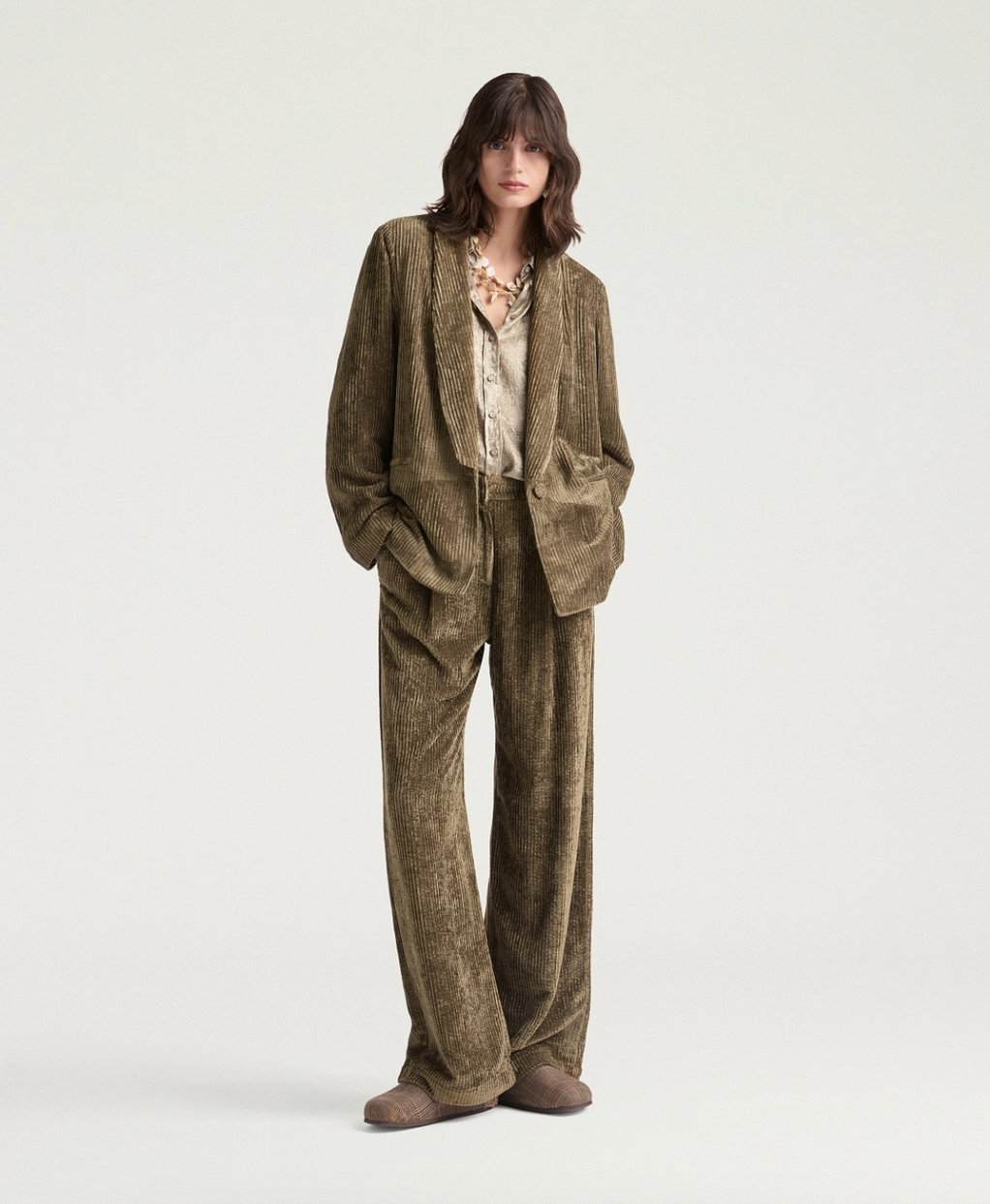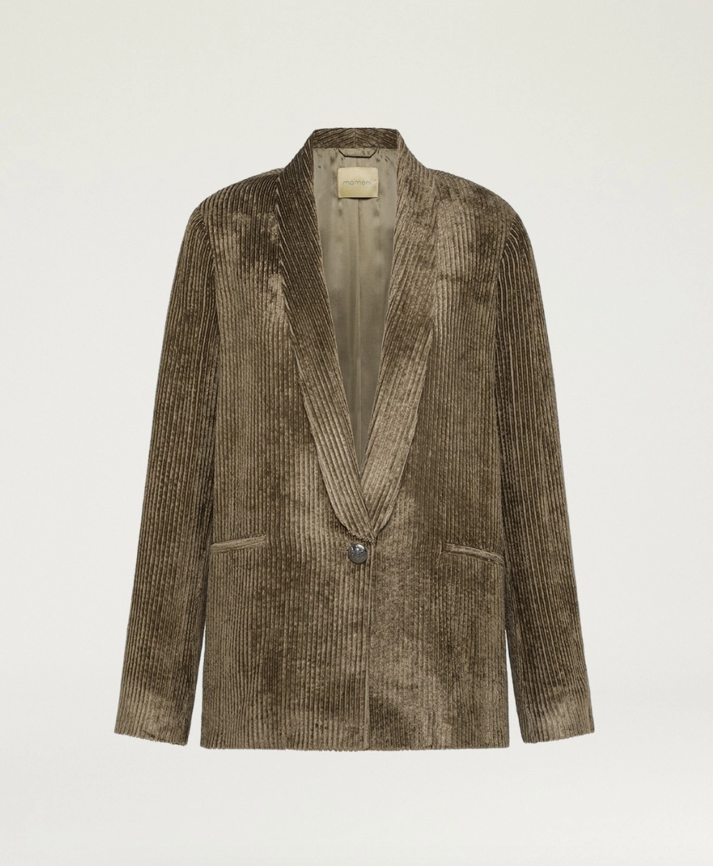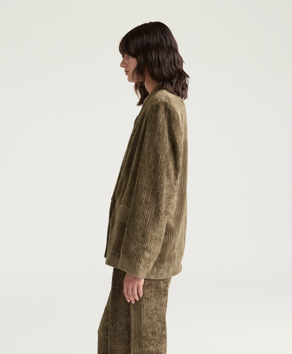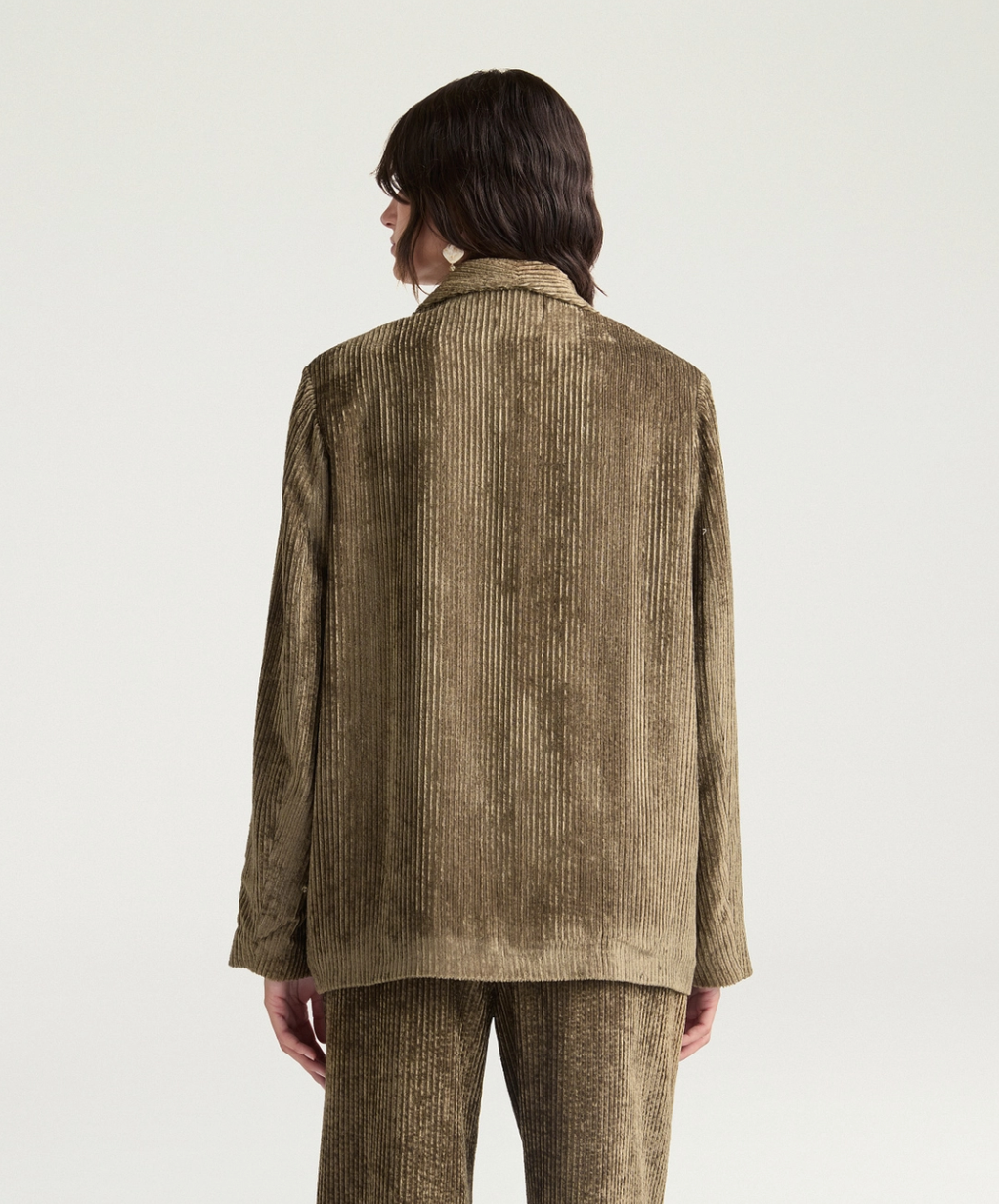 Veste élégante en velours à côtes fluide kaki. Ligne boxy confortable, patte de boutonnage basse à un seul bouton de corne, col châle. Coupe ajustée.