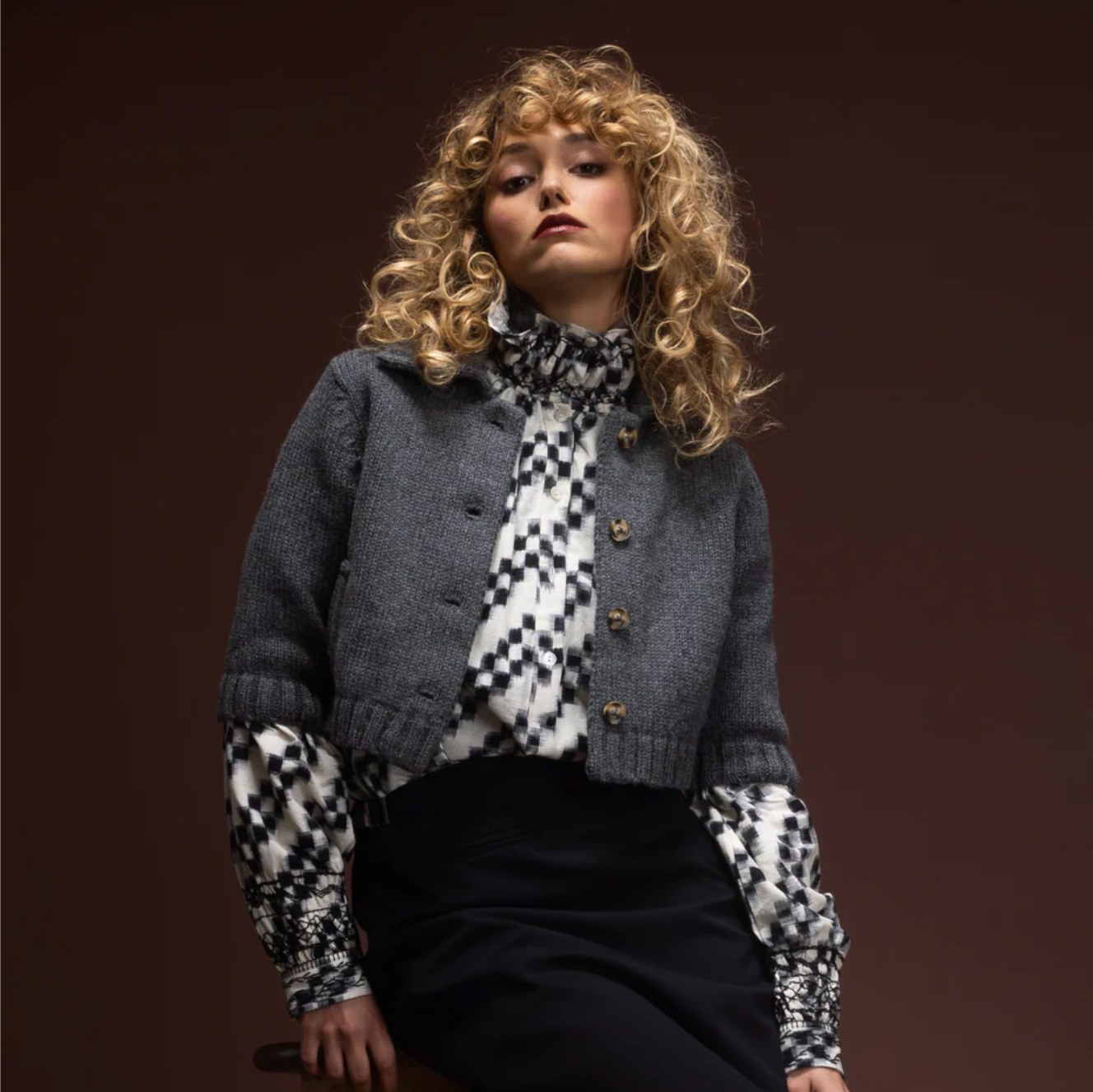 Blouse Abril au col montant froncé et manches bouffantes. Jeu de contrastes subtil, se porte col montant ou ouvert. Coupe droite et manches longues. Prendre sa taille habituelle.