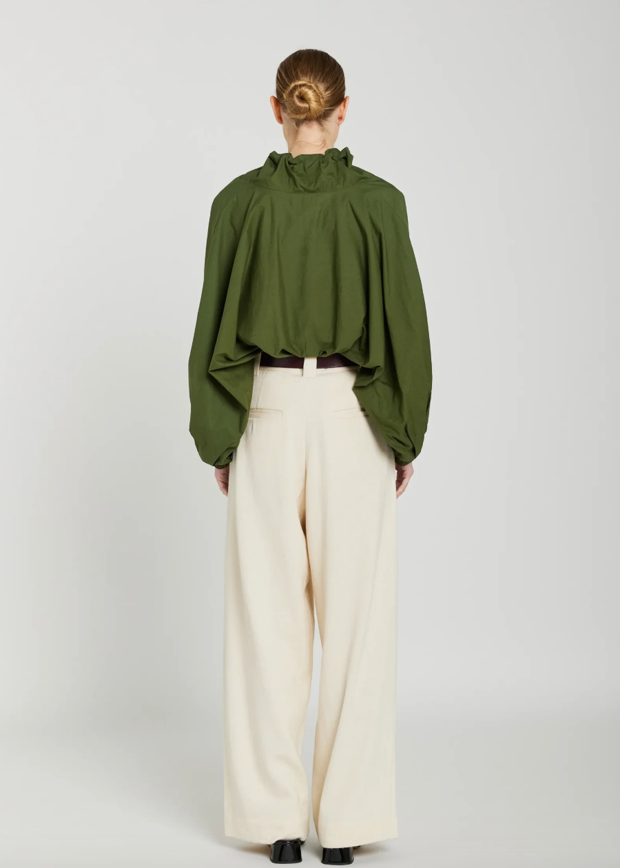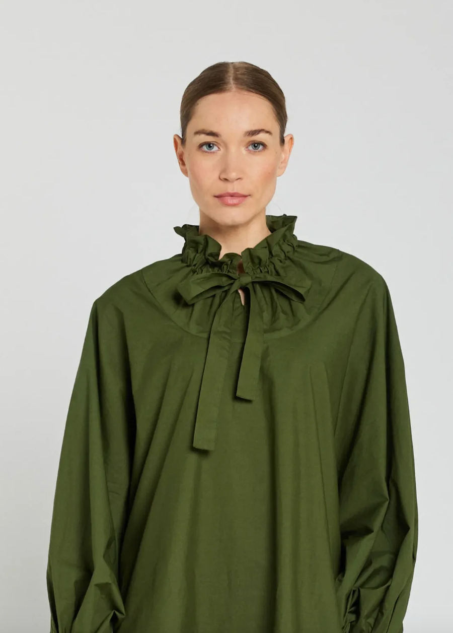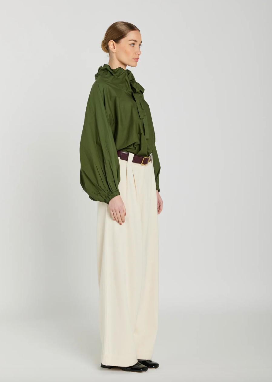 Blouse Clara au col froncé, ajustable par deux larges liens. À porter col fermé noué ou col ouvert selon l'envie. Manches longues et coupe ample et aérienne. Prendre sa taille habituelle.