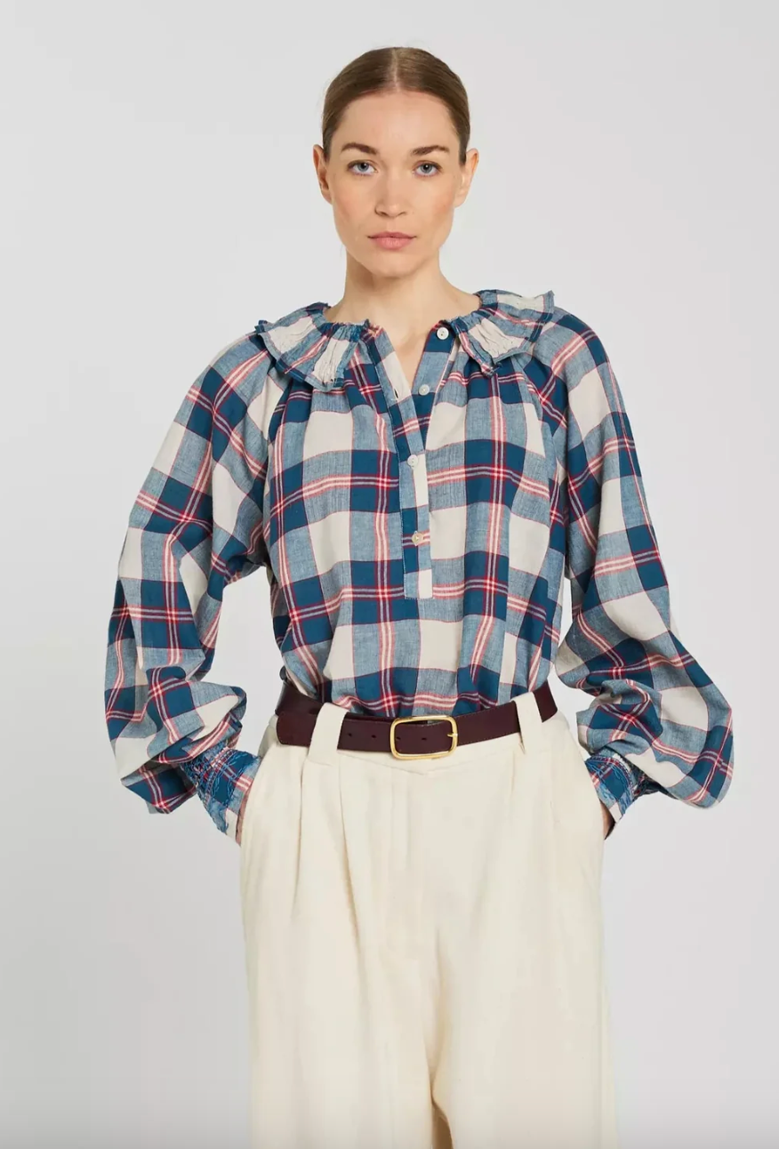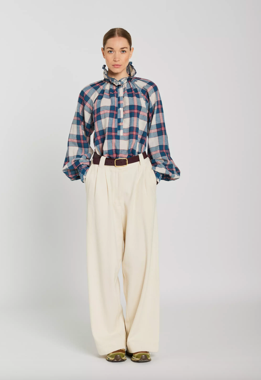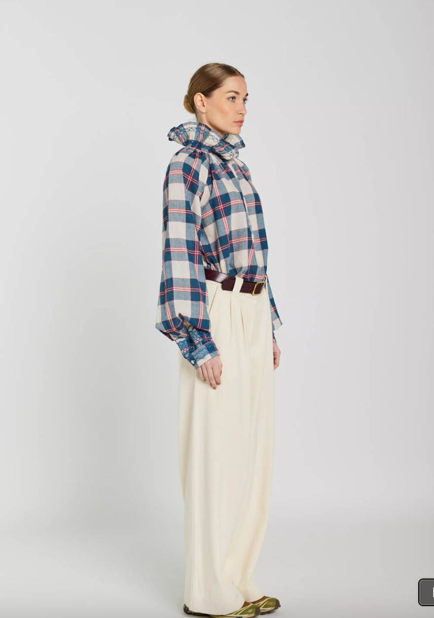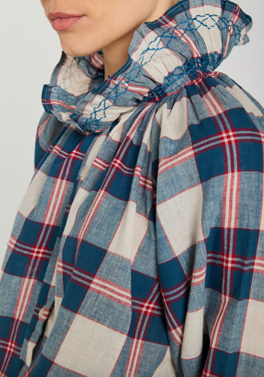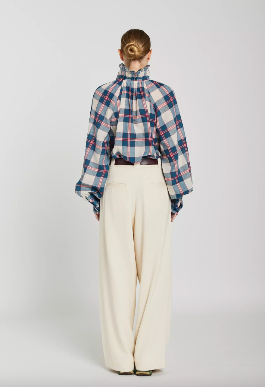 Blouse Abril au col montant froncé et manches bouffantes. Jeu de contrastes subtil, se porte col montant ou ouvert. Coupe droite et manches longues. Prendre sa taille habituelle.