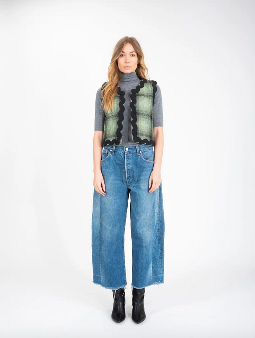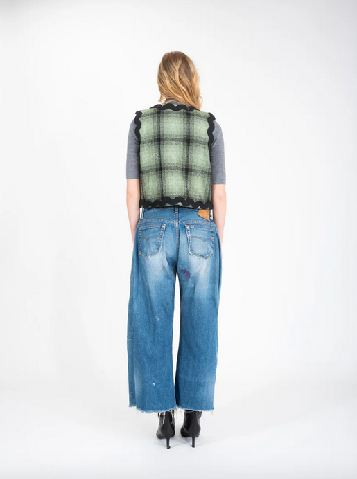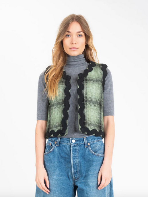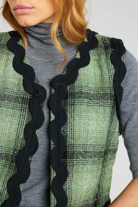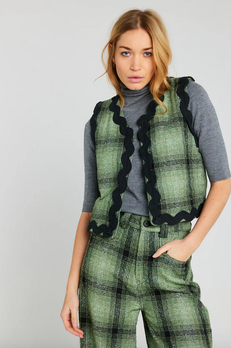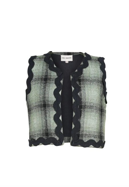 Le boléro en tweed à carreaux vert Free V de Vinster est doublé, a une coupe droite et taille normalement, sans être oversize. La mannequin mesure 1.75m et porte une taille M, qui fait 48 cm de longueur.