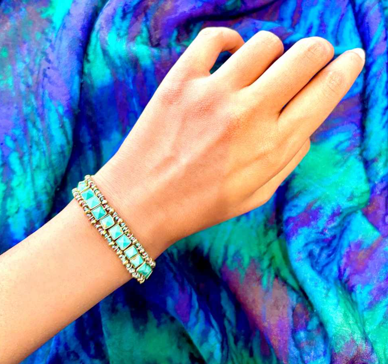 Composition : Turquoise d'Arizona, hématite dorée. Argent 925 plaqué or 24 carats, 3 microns.