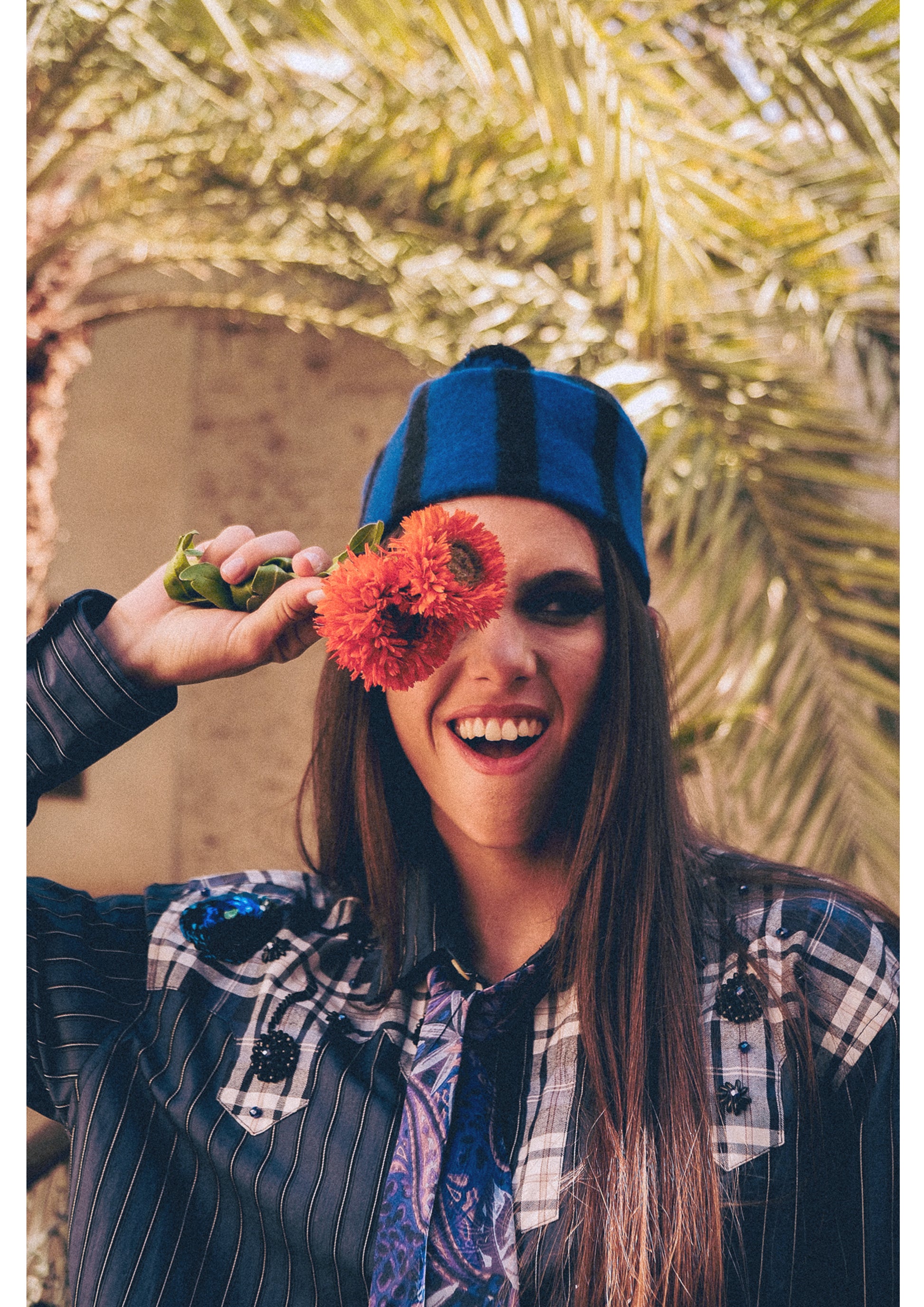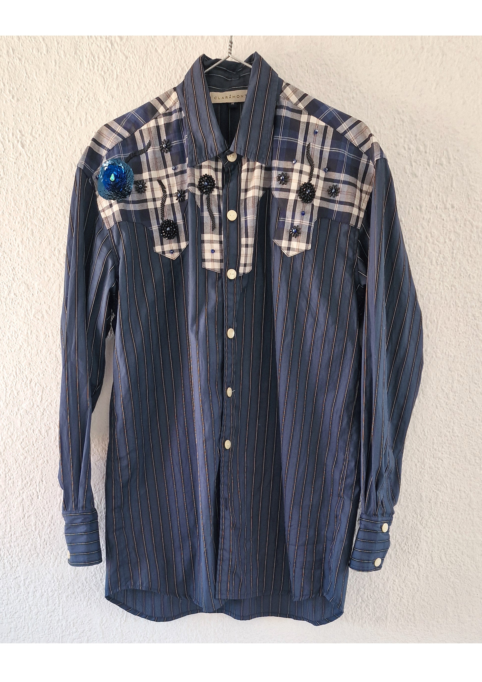 Chemise style western revisitée, empiècements contrastés sur les épaules et la poitrine. Broderies et perles décoratives sur la partie à carreaux.