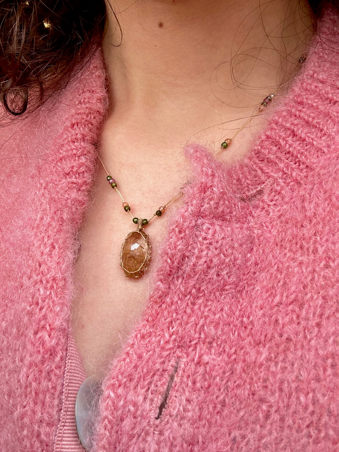 Pierre pendentif montée sur un fil de soie résistant, associé à de petites pierres semi-précieuses le long du collier.