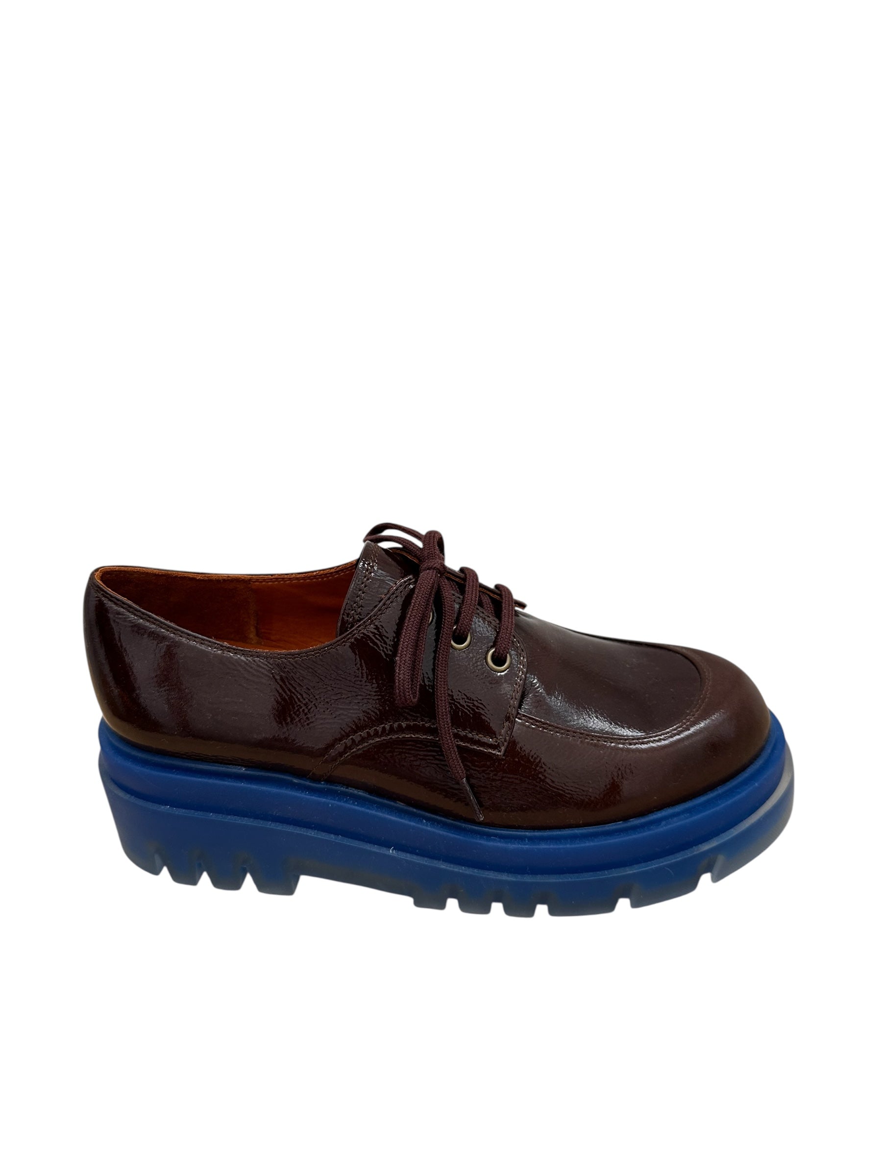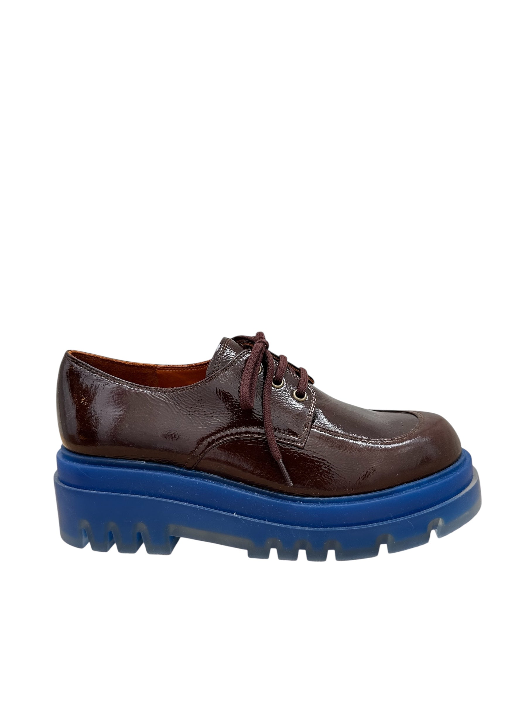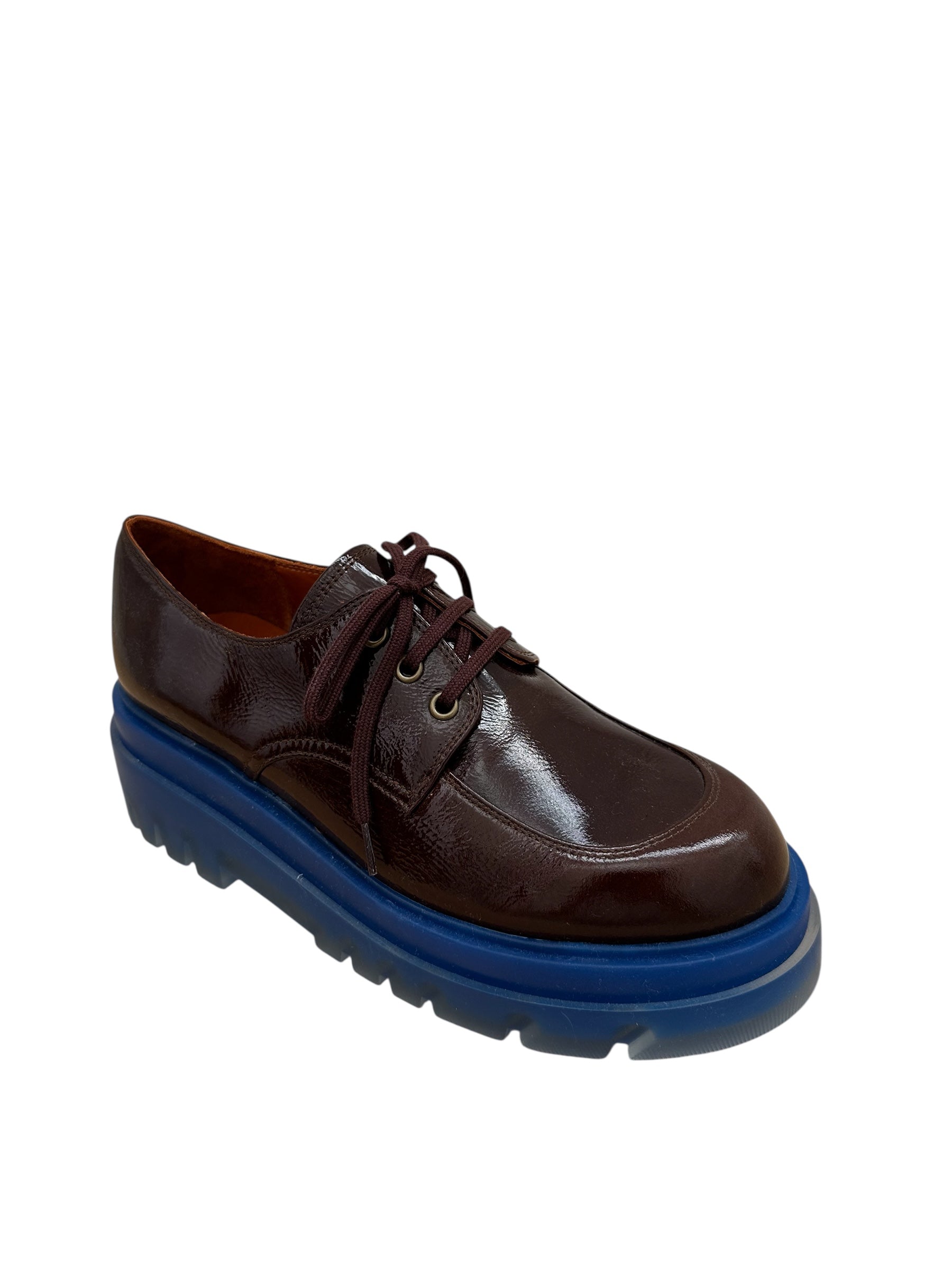 Chaussure derby à semelle épaisse plateforme en caoutchouc coloré bleue, avec dessus en cuir vernis marron