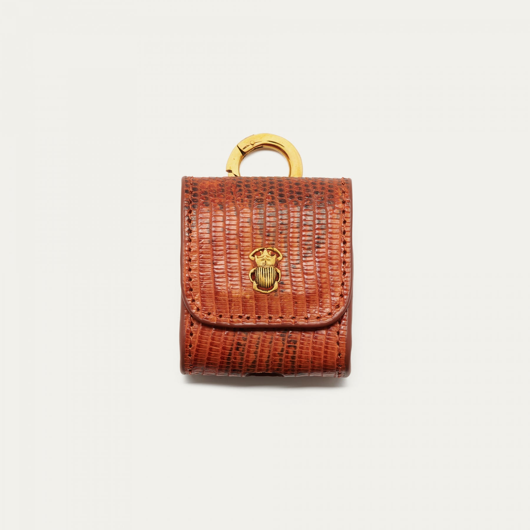 Etui d'Airpods 2ème génération entièrement composé de lézard orné d'une beetle dorée à l'avant. Son mousqueton vous permettra de l'accrocher aussi bien à vos passants de pantalon, qu'à votre sac ou étui de téléphone portable.