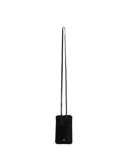 Mobile phone holder in black suede leather. Card holder on the back. To be worn over the shoulder. Case suitable for any type of phone.
