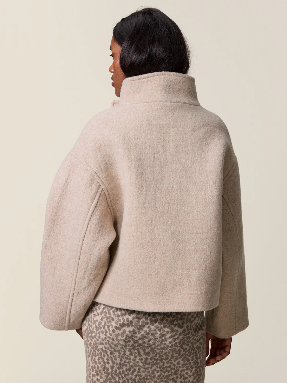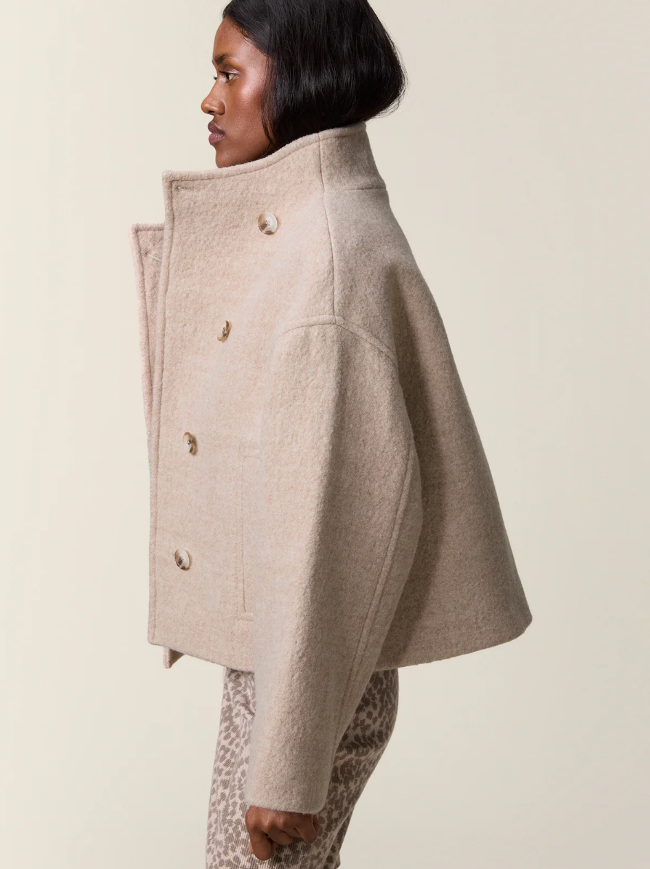 Manteau court en drap de laine beige. Col montant, manches longues raglan, boutonnière décalée, poches raglan, coupe oversize.