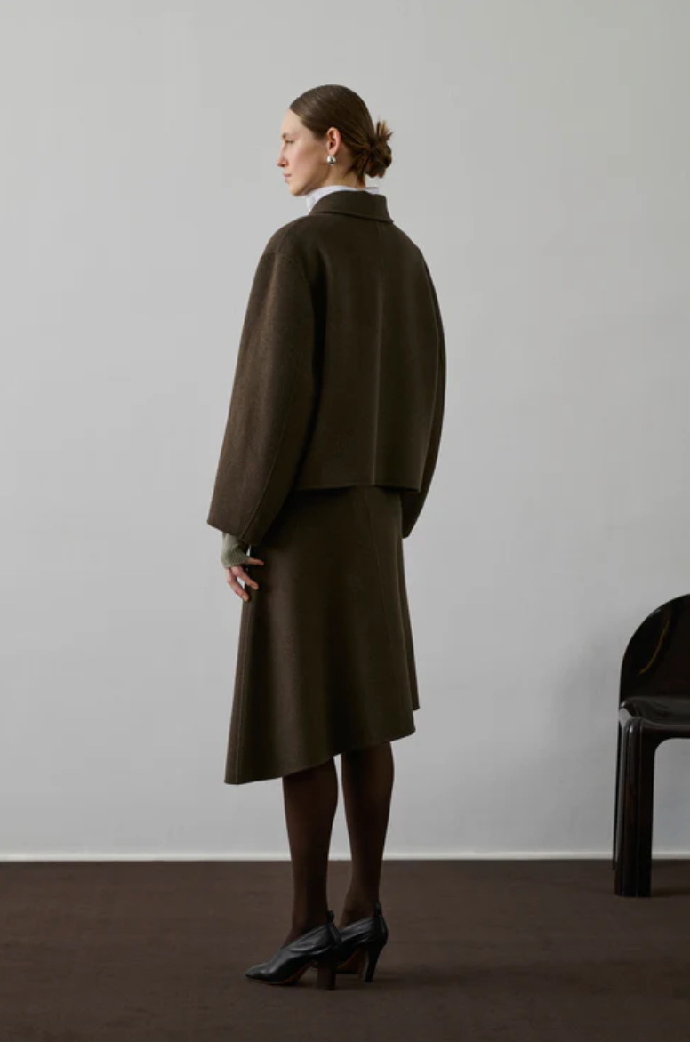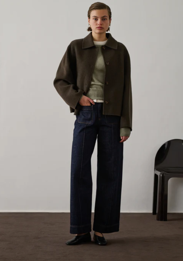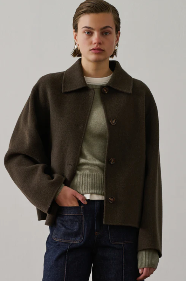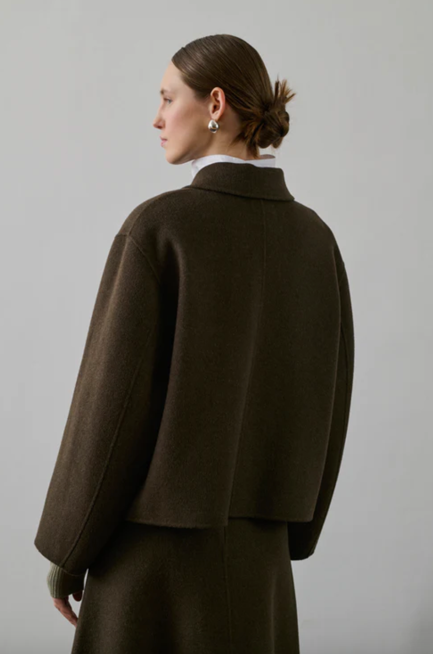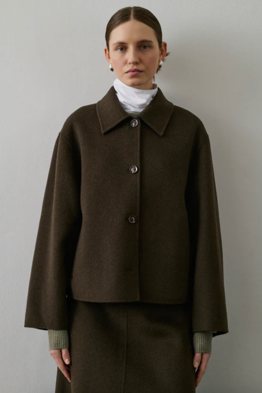 Manteau court en laine Gyoda, coloris kaki/brun. Coupe droite, col chemise, ouverture boutonnée, deux poches passepoilées devant.