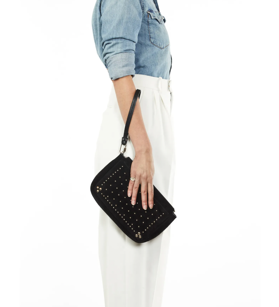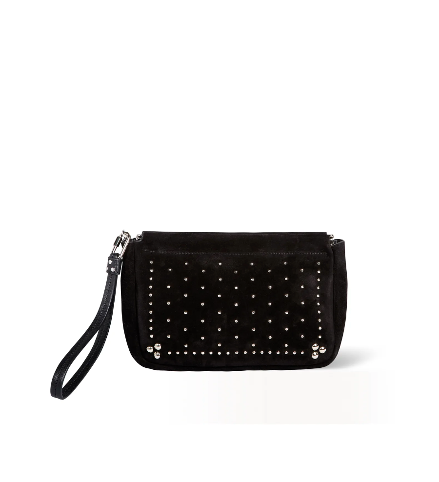 Black suede leather pouch with removable wrist strap by carabiner. Ratchet clasp. Silver rivets. Interior lined in leather. To wear as a clutch or to slip into your handbag.