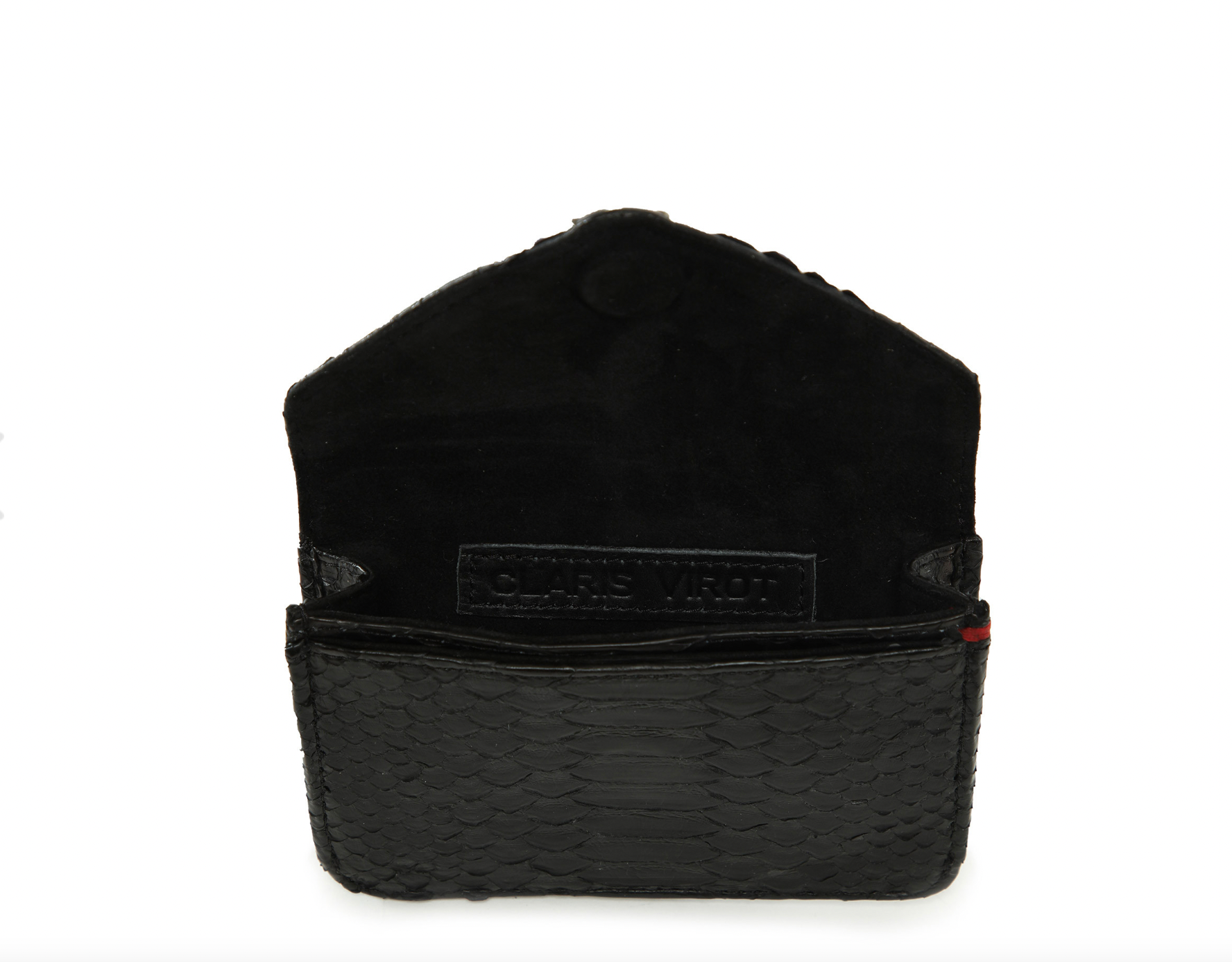 Women's black python leather card holder with silver beetle. Envelope form. Magnet closure. Two compartments, one with a patch pocket.