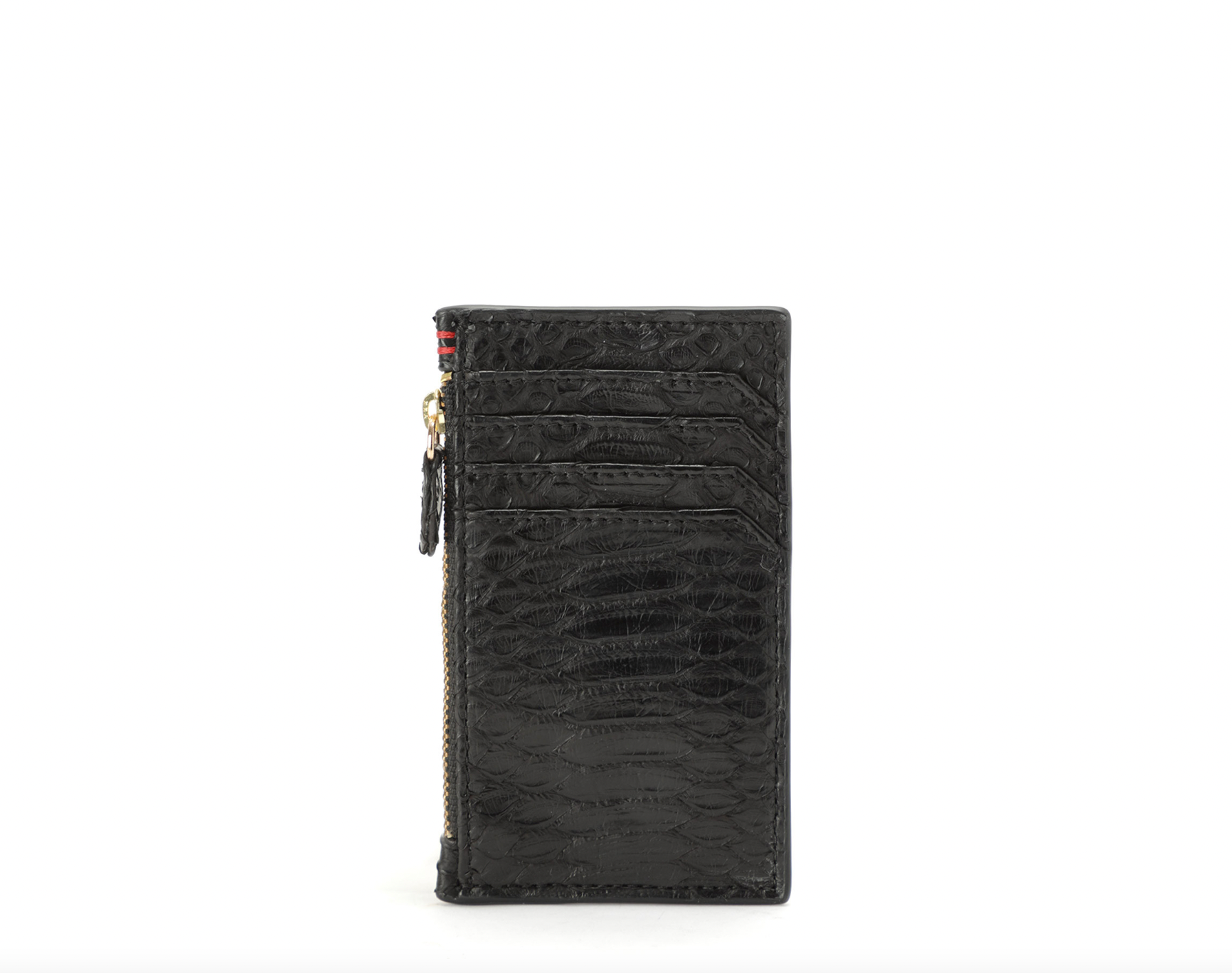 Black python card holder. Golden zip closure. Four card inserts and a pocket. Double.
