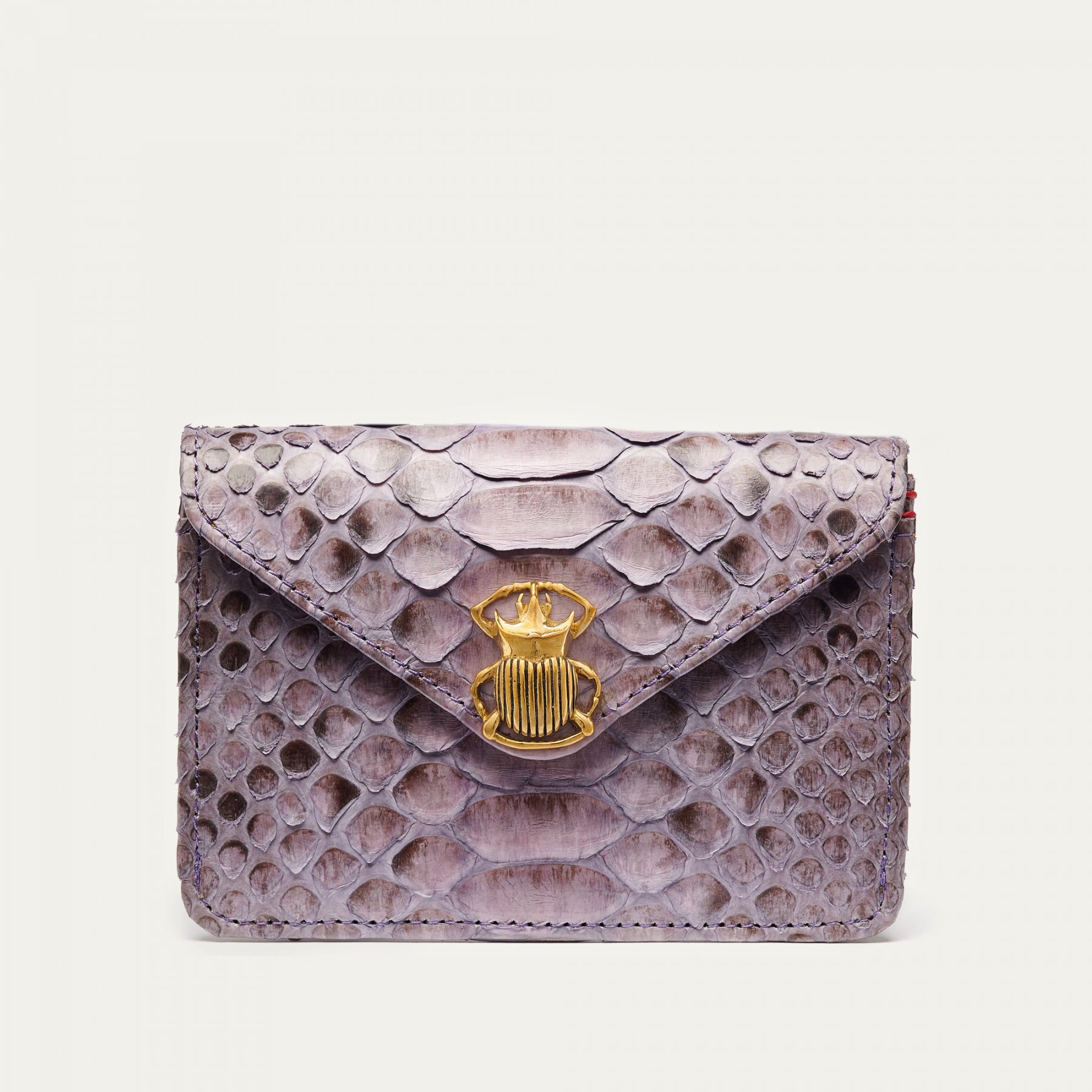 Petite pochette en python en forme d'enveloppe ornée d'un fermoir en forme de scarabée en laiton. Parfaite pour garder tous vos petits papiers et votre monnaie grâce à ses différents compartiments, elle se glissera facilement dans tous vos sacs.
