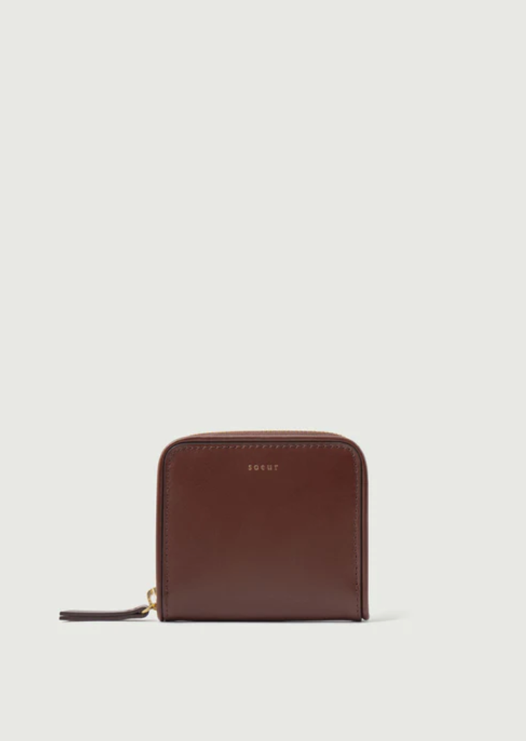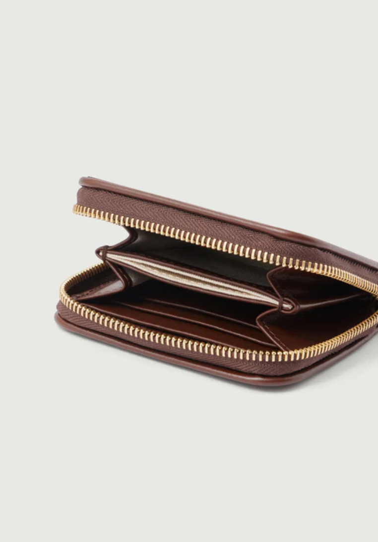 Porte-monnaie zippé en cuir box moka. Séparé en deux parties, possède six fentes pour cartes de crédit.