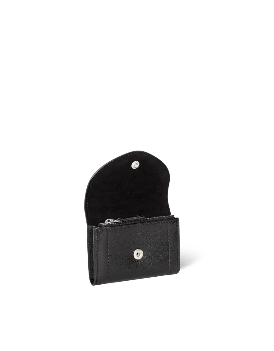 Portefeuille en cuir lisse buffle noir. Fermeture à pression. Rivets argentés. Intérieur doublé en coton organisé avec un rangement monnaies zippé, un emplacement billets et deux emplacements cartes.
