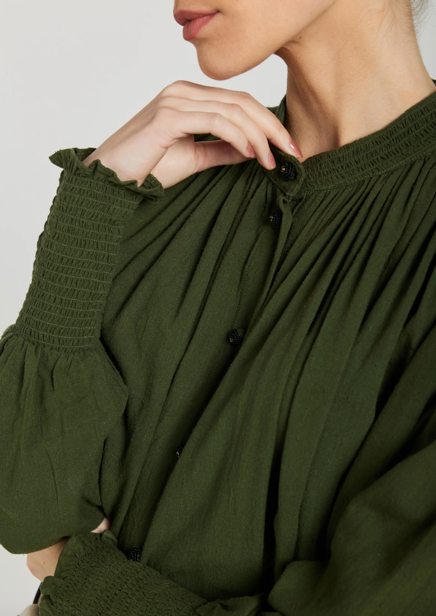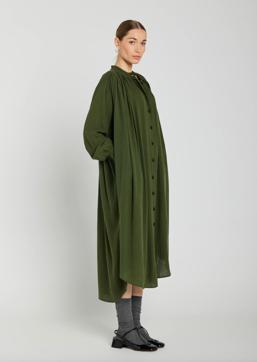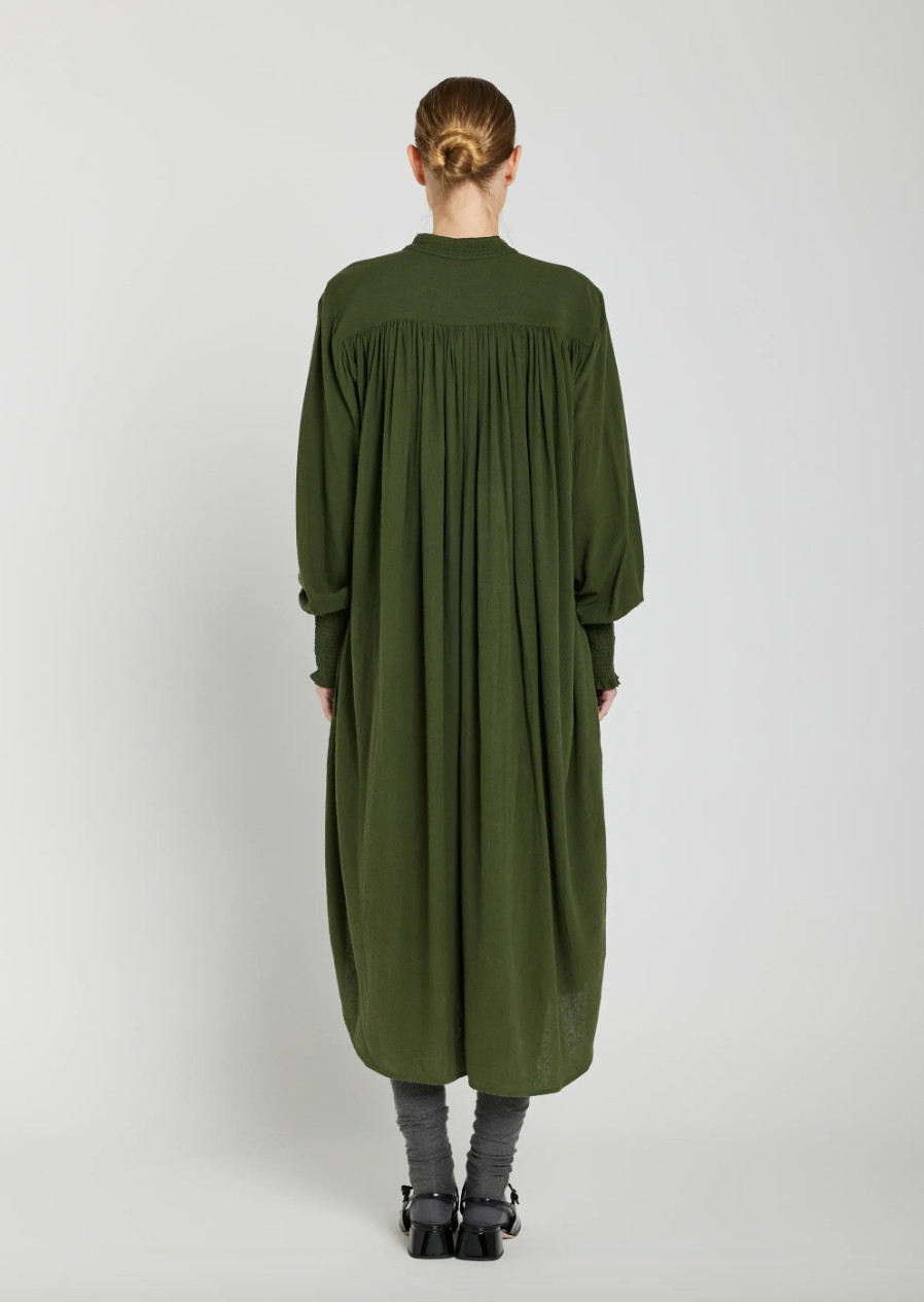 La robe longue Cesar séduit par sa coupe évasée, son col mao délicat et ses manches froncées. Détail unique et élégant des poches et boutons perlés. Coupe droite, manches longues élastiquées. Prendre sa taille habituelle.