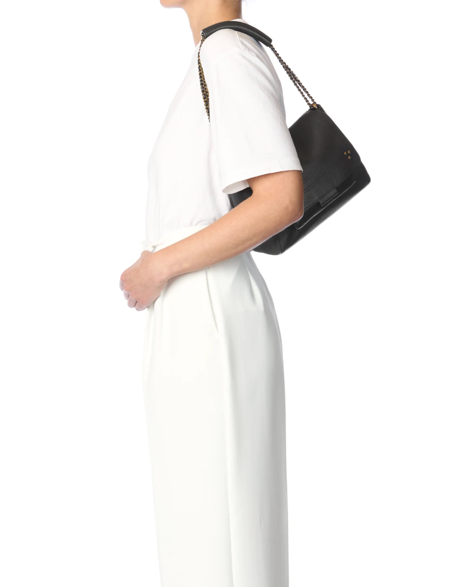 Sac pouvant être portée à l'épaule ou croisée. Bandoulière en cuir et chaîne, détachable et modulable. Dotée d'un rabat avec fermeture aimantée.