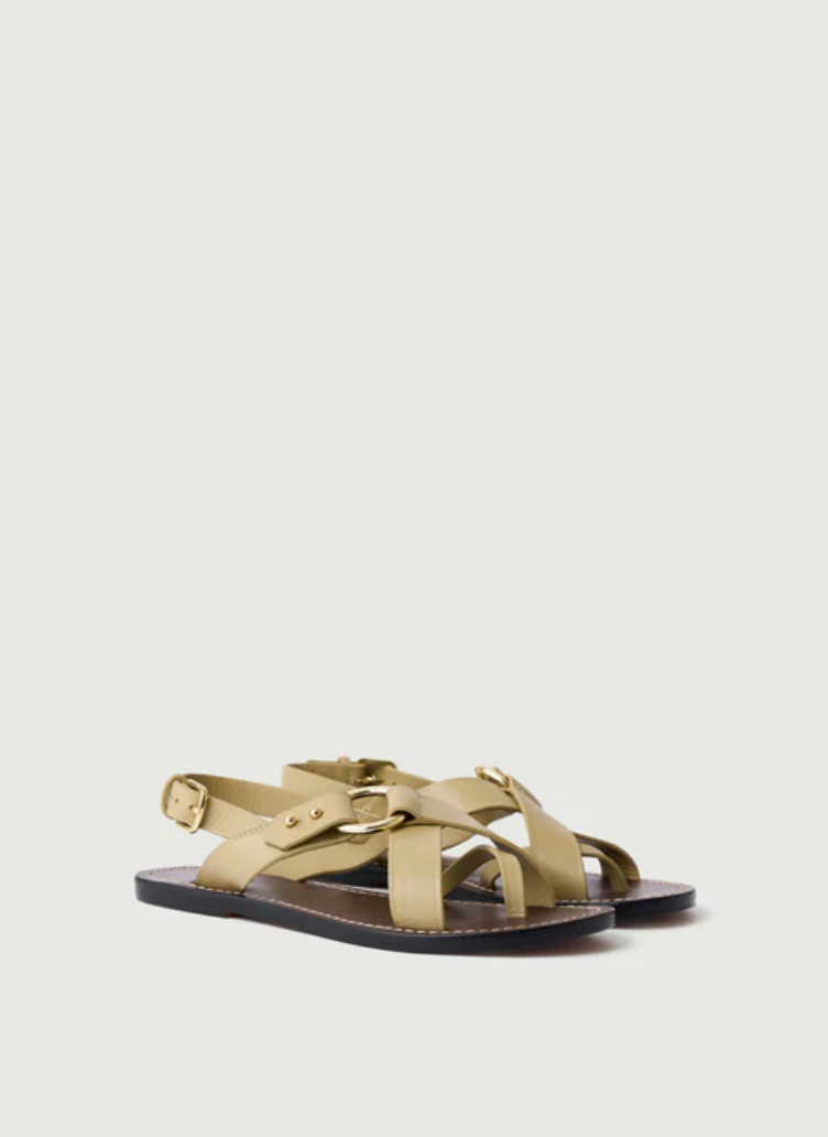 Sandales plates en cuir lisse beige avec brides croisées. Ouverture par bride ajustable à la cheville. Métallerie dorée et anneau décoratif à l'avant. Modèle de sandale intemporelle de chez Soeur.