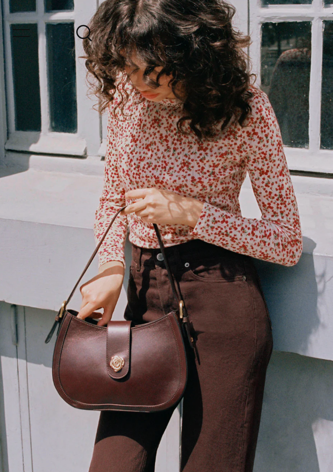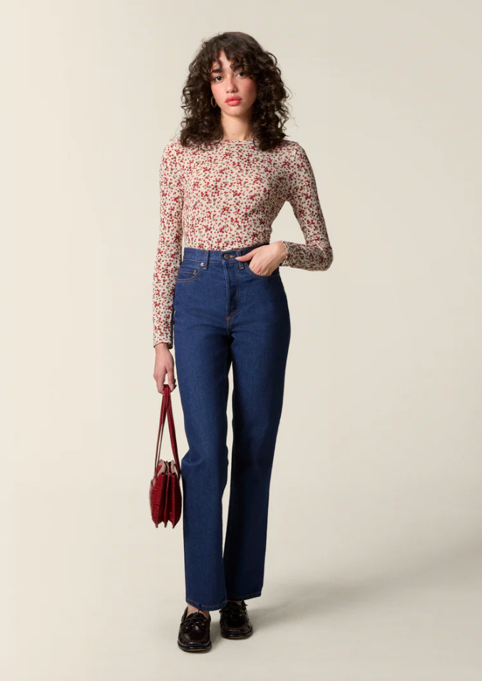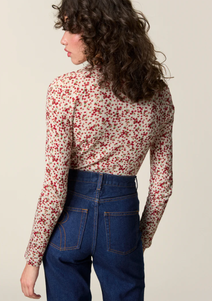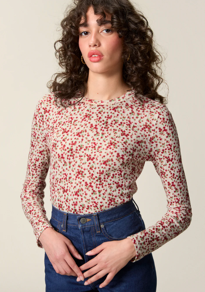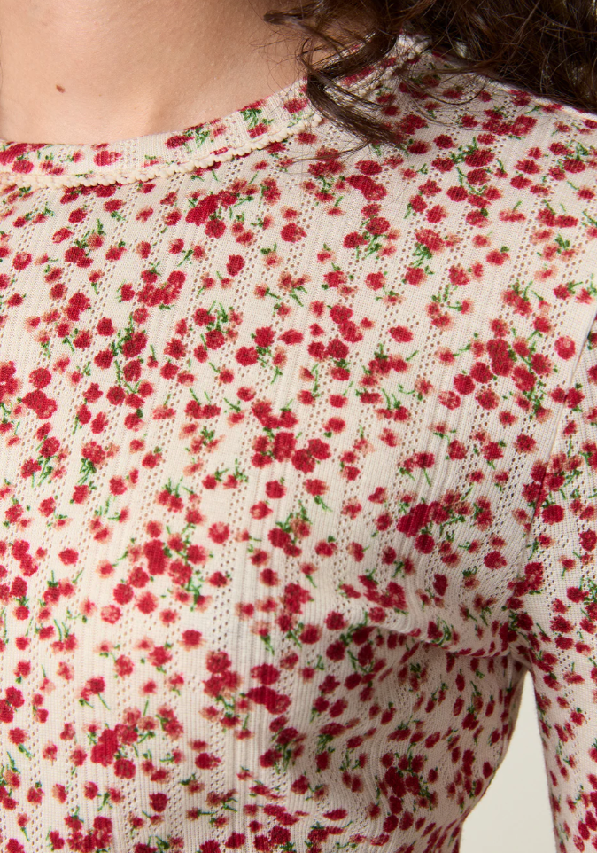 T-shirt en maille pointelle imprimé fleuri craie. Manches longues, col rond finitions picots.