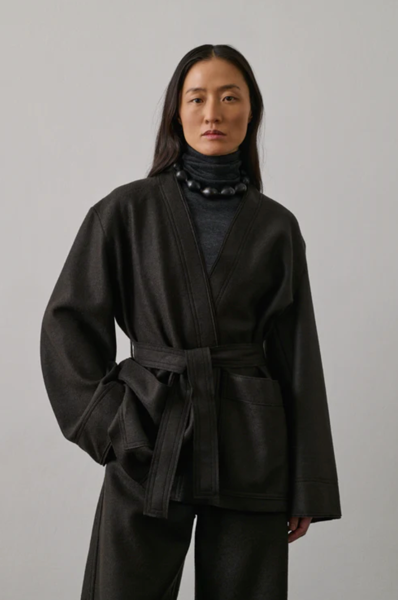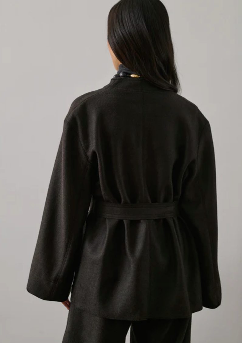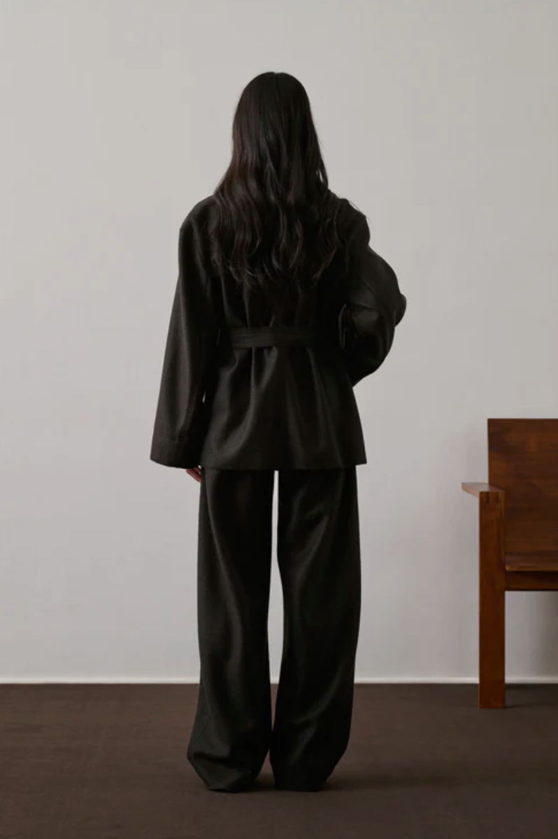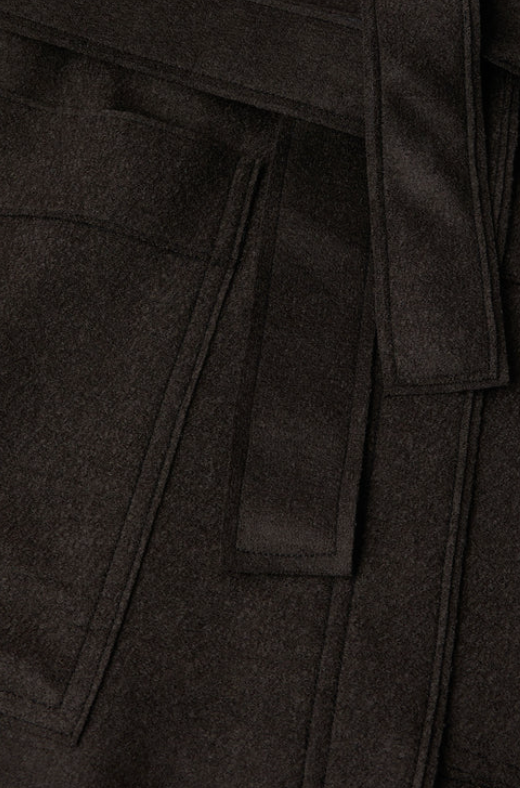 Veste Balme en laine bouillie vert ébène. Coupe portefeuille, ouverture devant croisée avec ceinture, deux grandes poches plaquées devant.