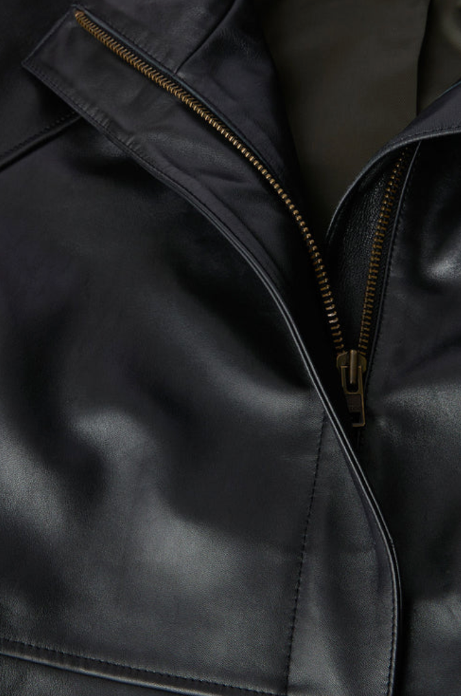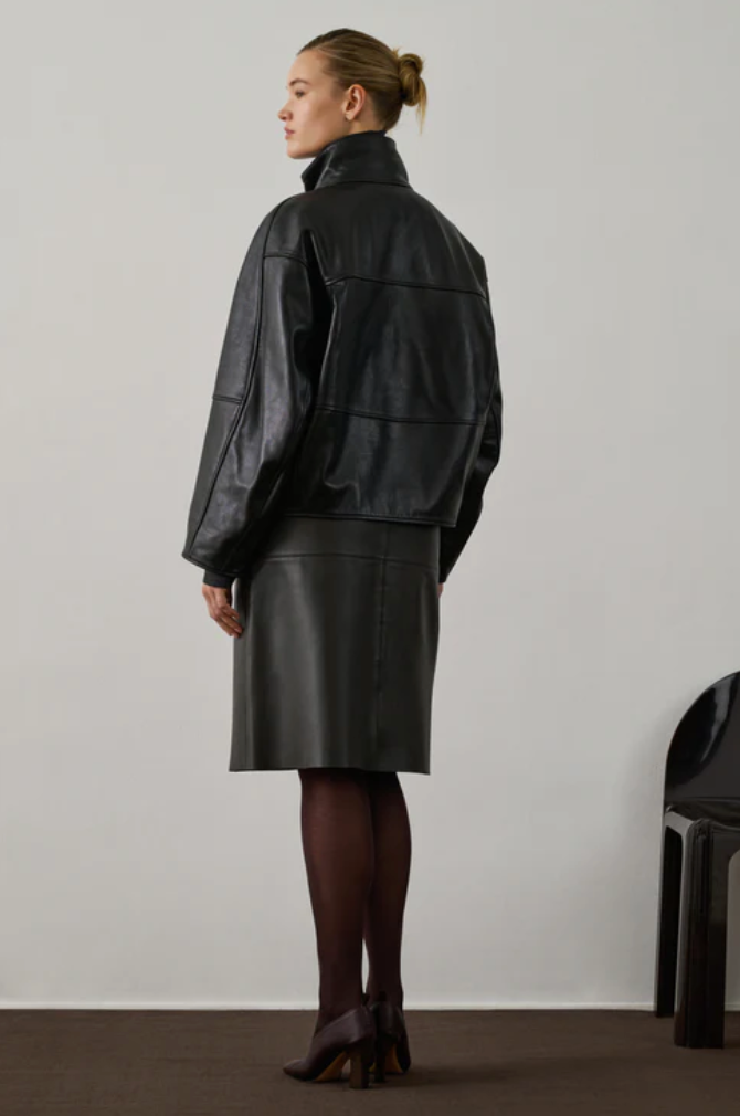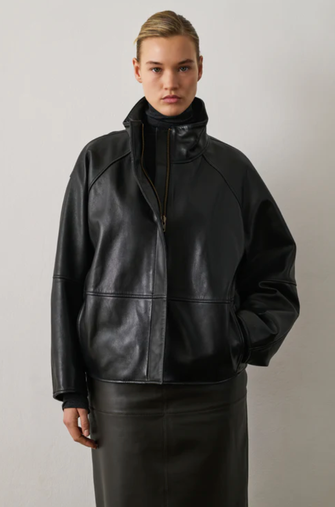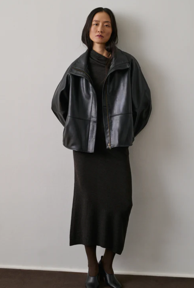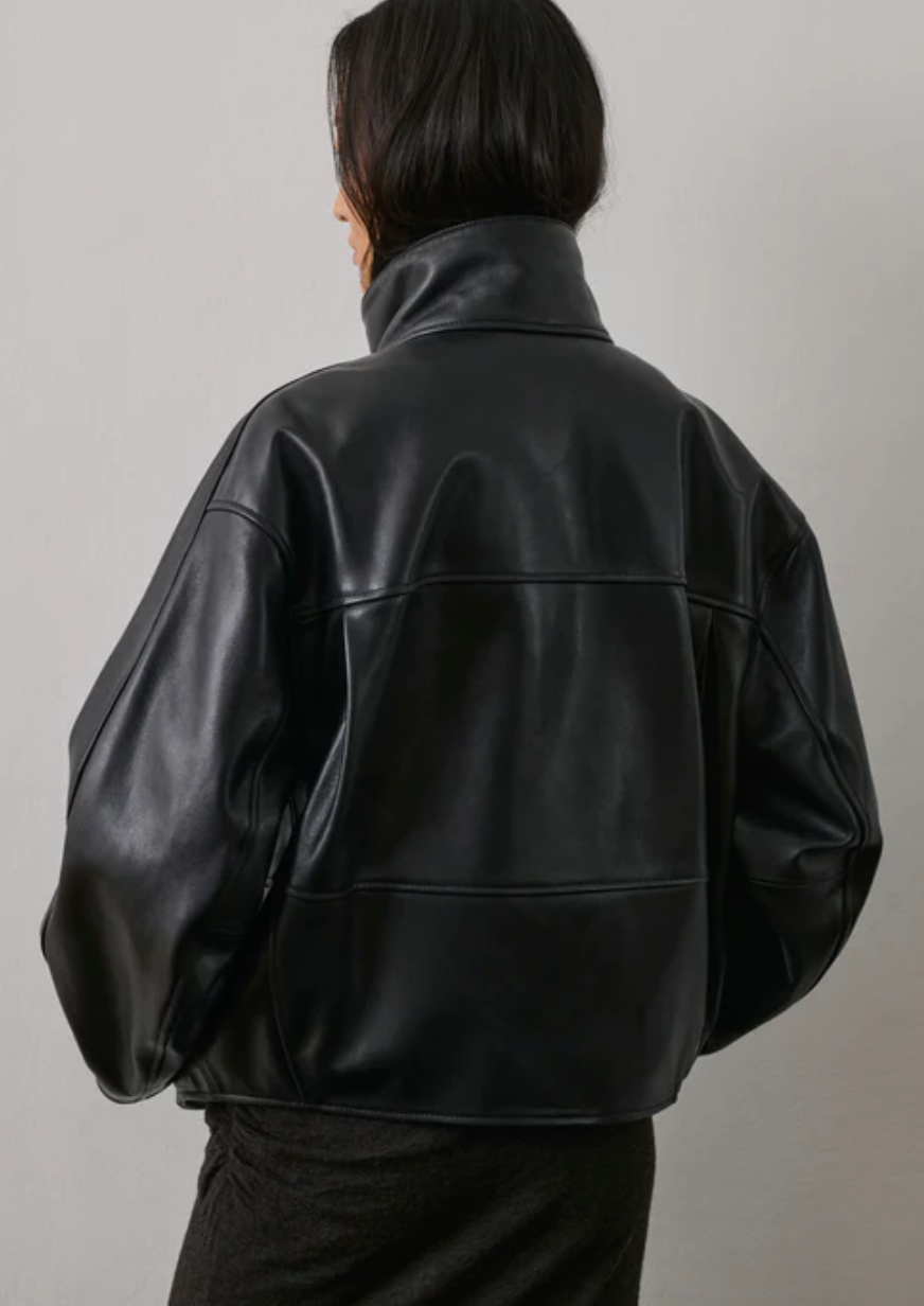 Veste en cuir noir Gamma. Forme volontairement très ronde et oversize, col montant, fermeture zip, deux poches devant. Cuir leather Working Group
