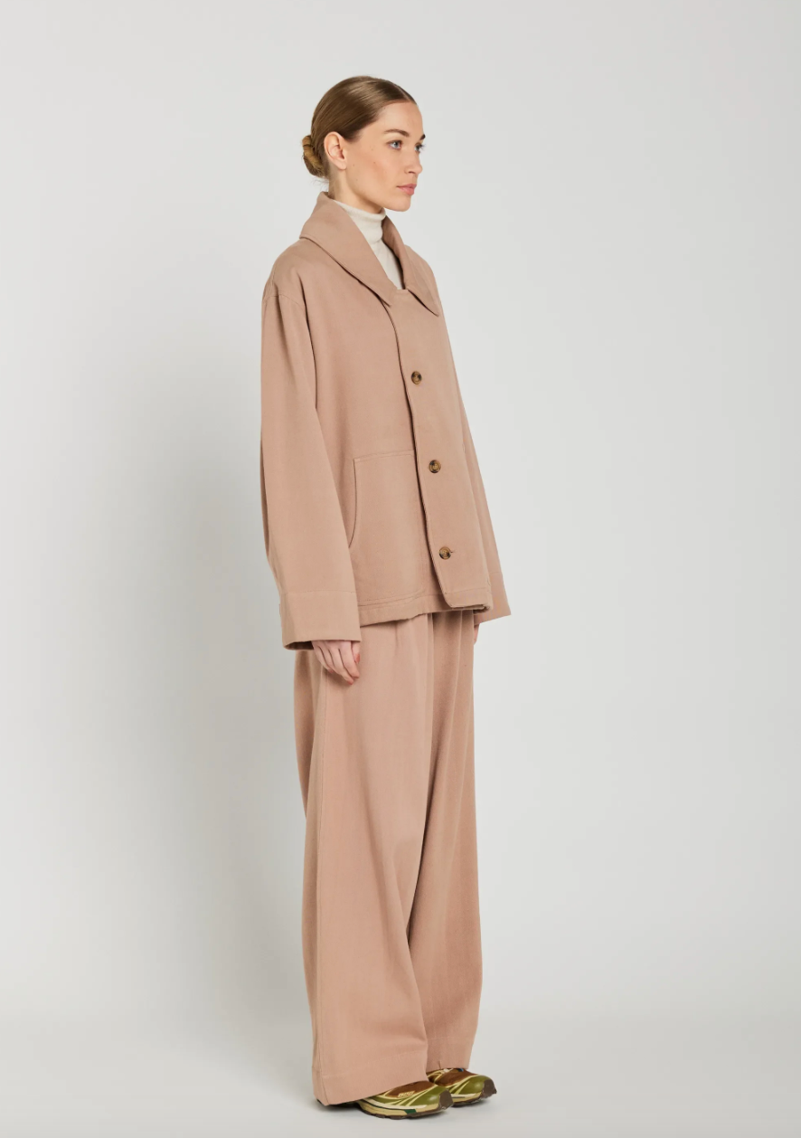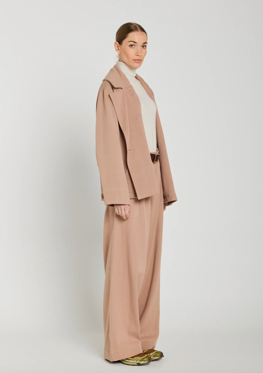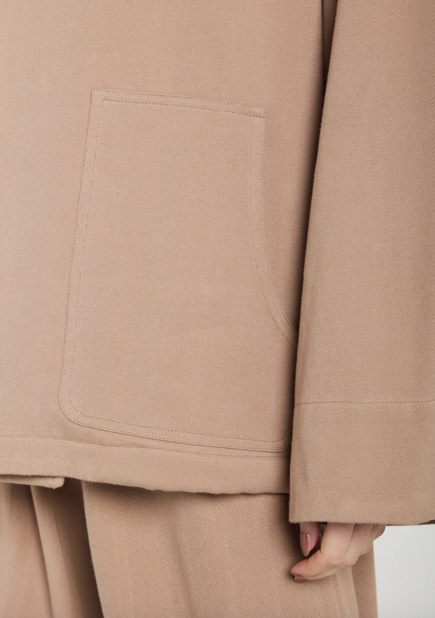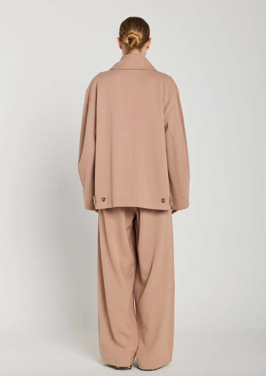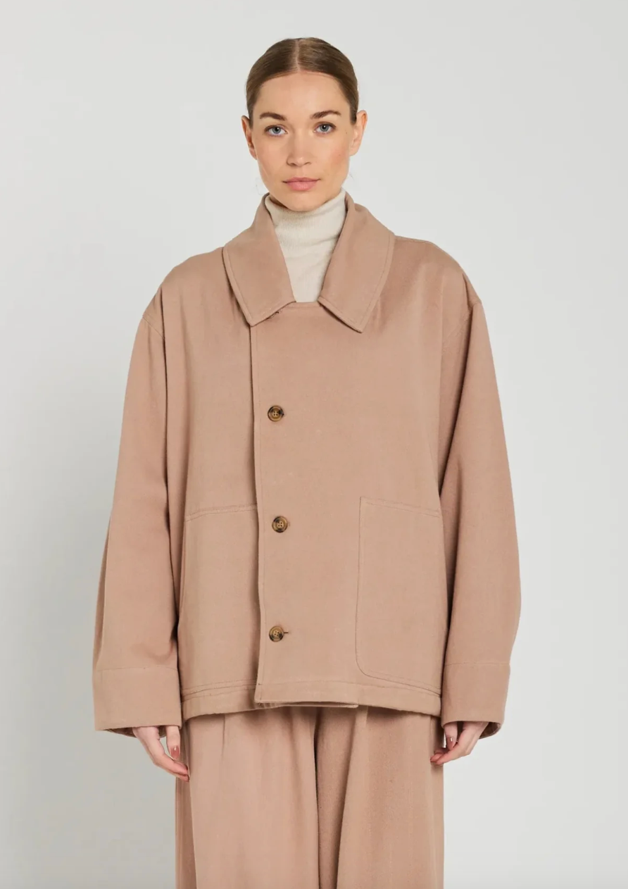 Veste Mona vieux rose qui revisite la veste chemise, avec sa coupe droite et ses boutons asymétriques. Poches plaquées, col chemise, apporte une touche graphique et contemporaine.