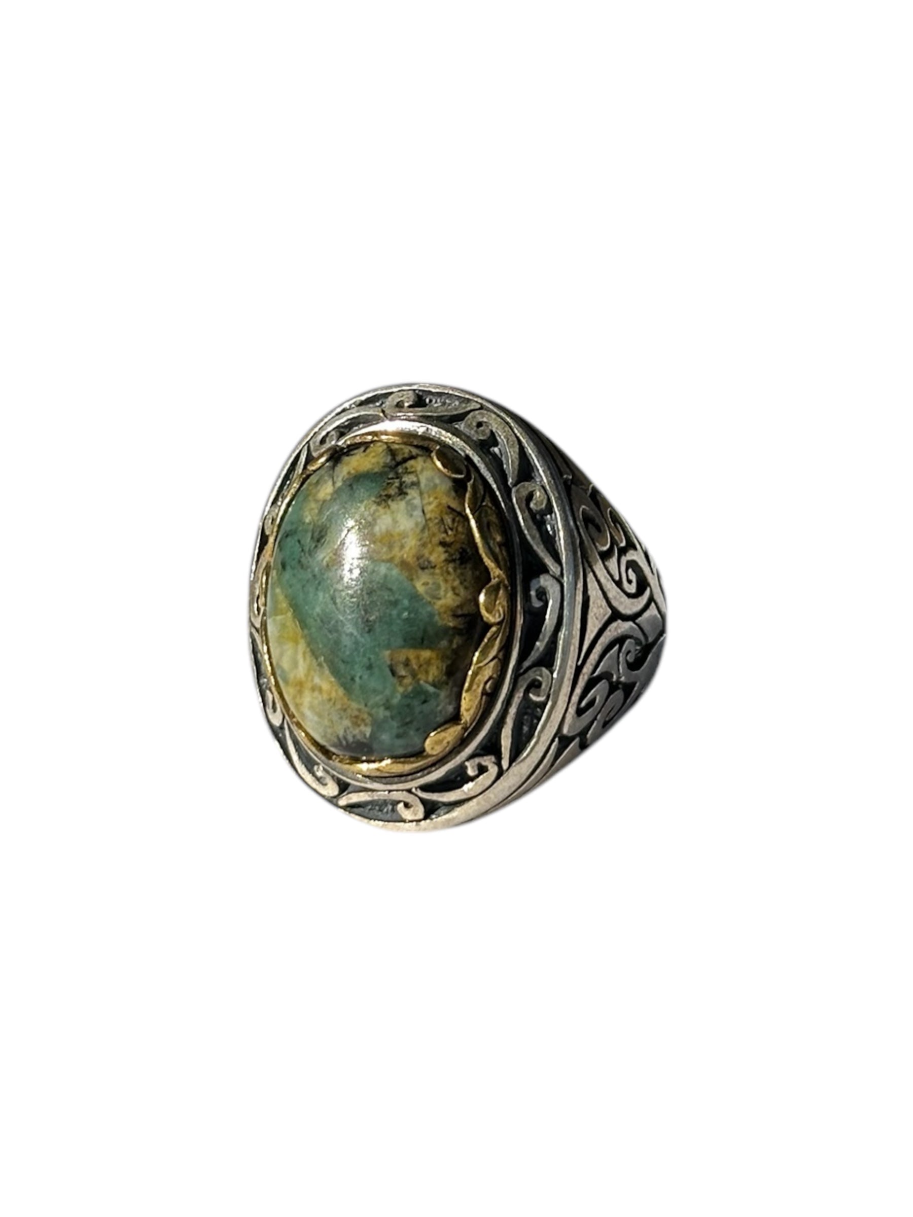 Bague en argent 925 ornée d'une pierre semi-précieuse, sertie de laiton. Ce modèle taille petit du fait de l'épaisseur de la monture, il est donc recommandé de prendre la taille au dessus de votre taille habituelle.