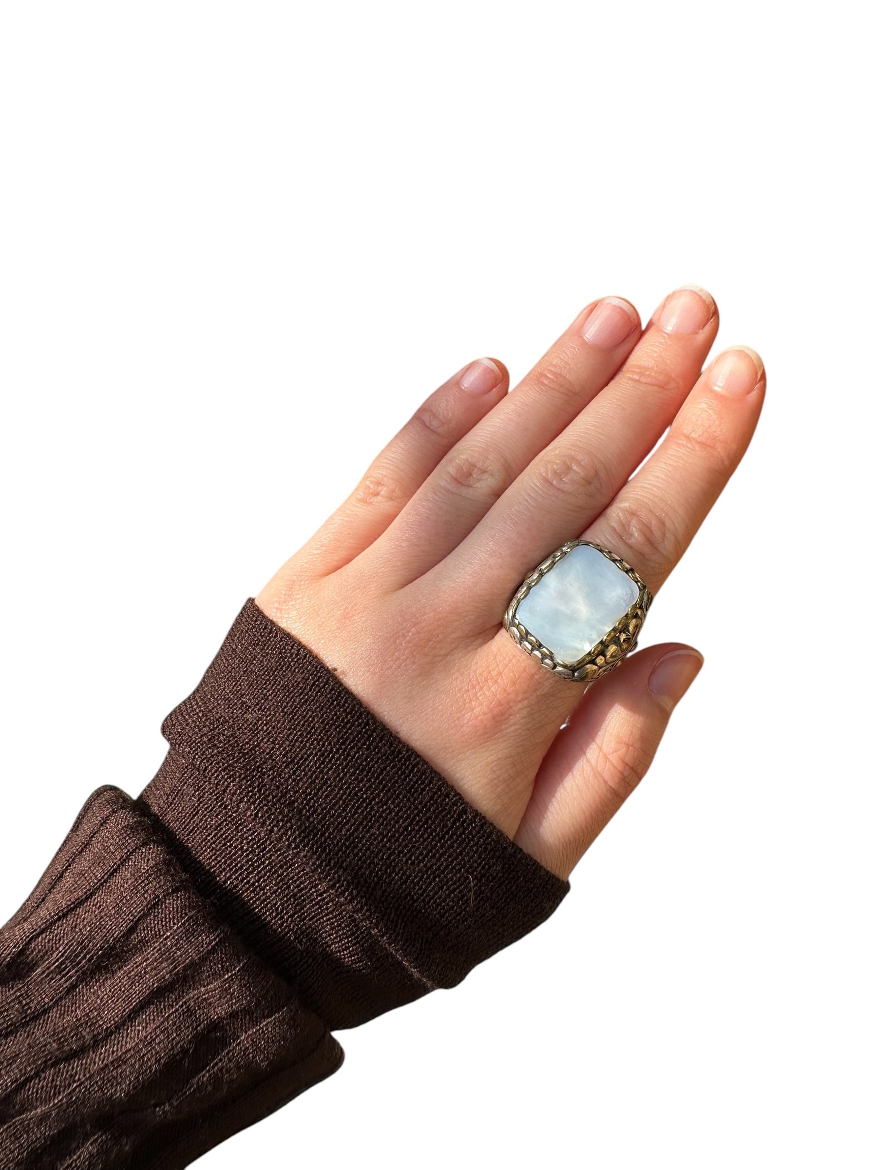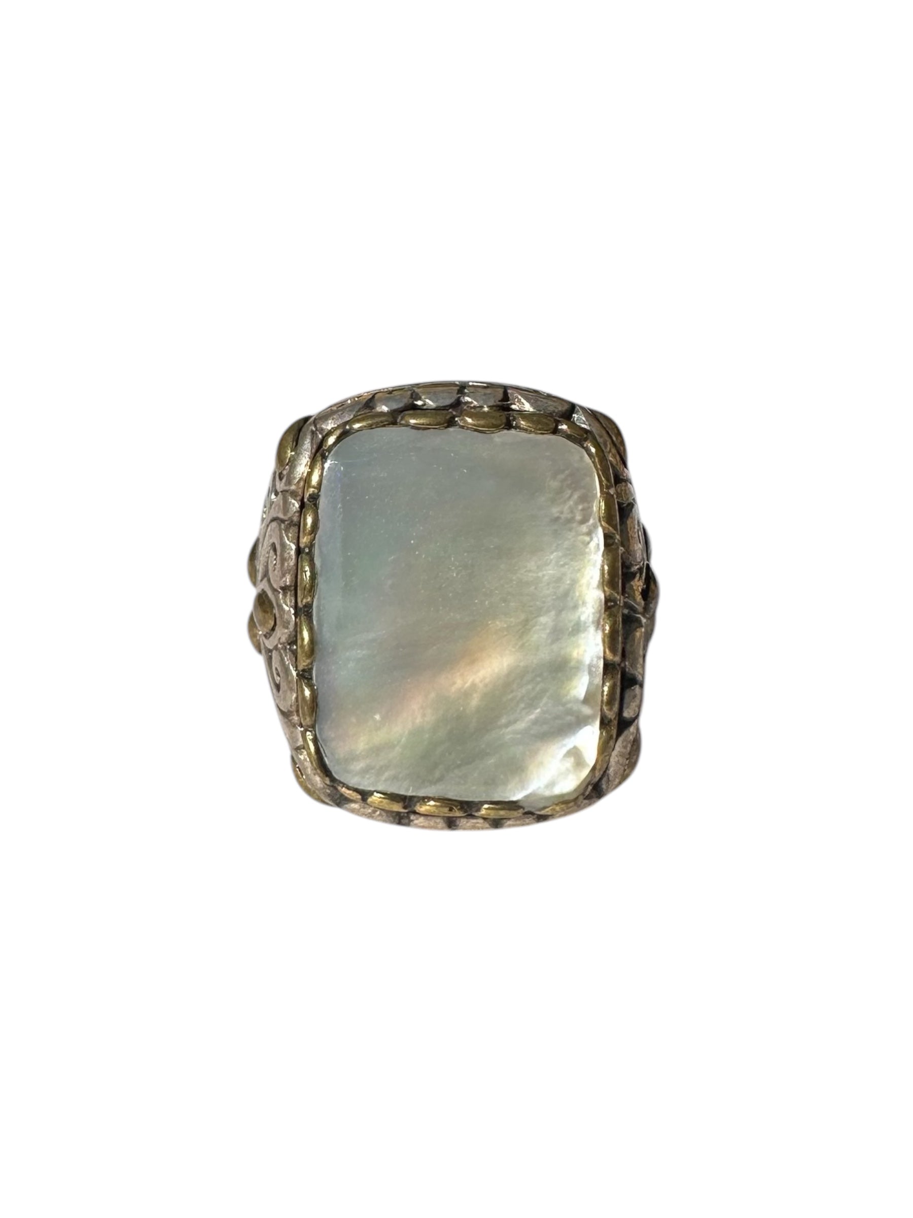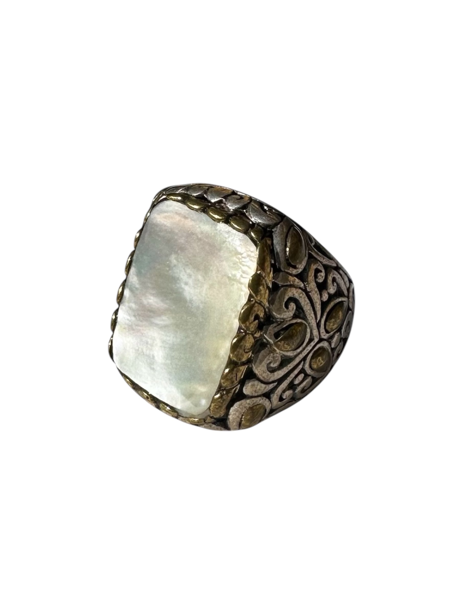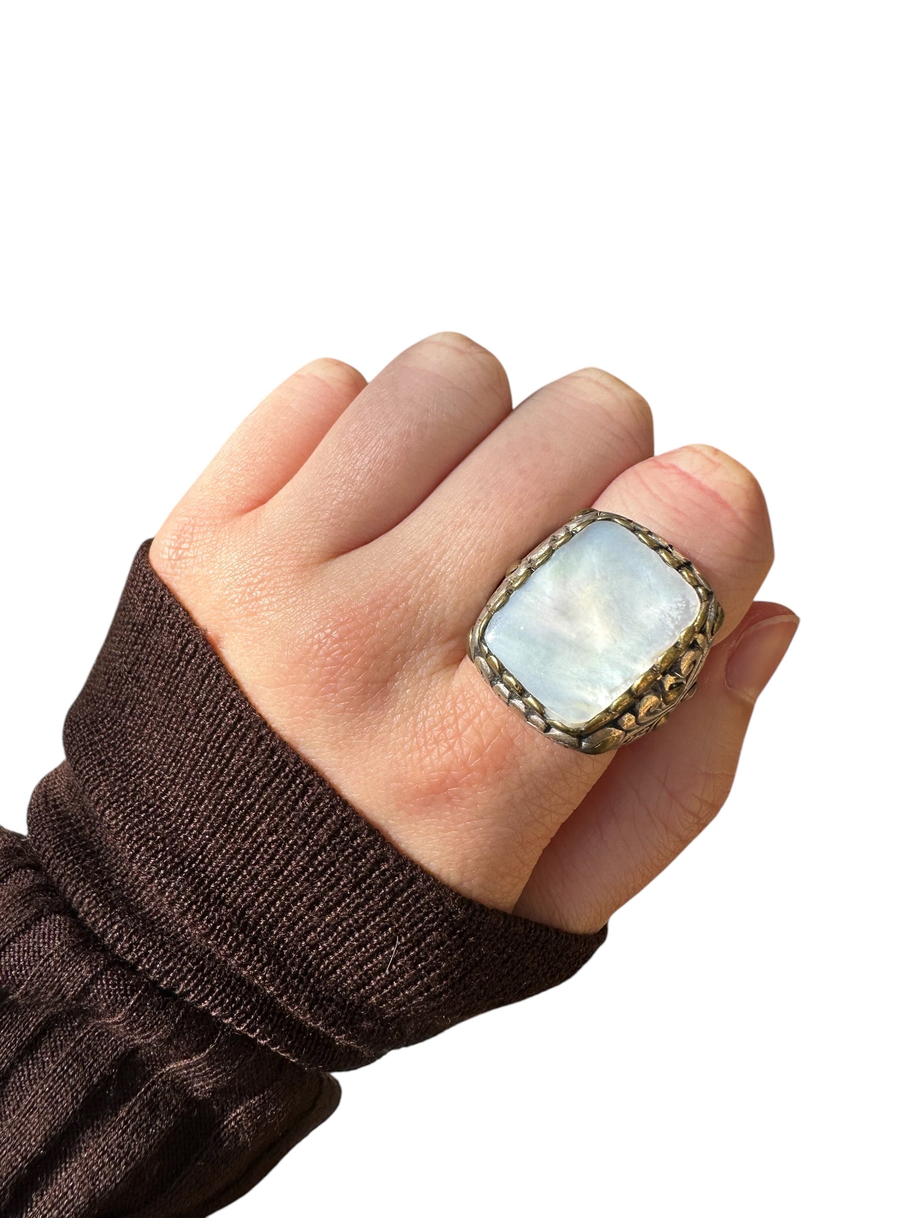 Bague en argent 925 ornée de nacre, sertie de laiton. Ce modèle taille petit du fait de l'épaisseur de la monture, il est donc recommandé de prendre la taille au dessus de votre taille habituelle.