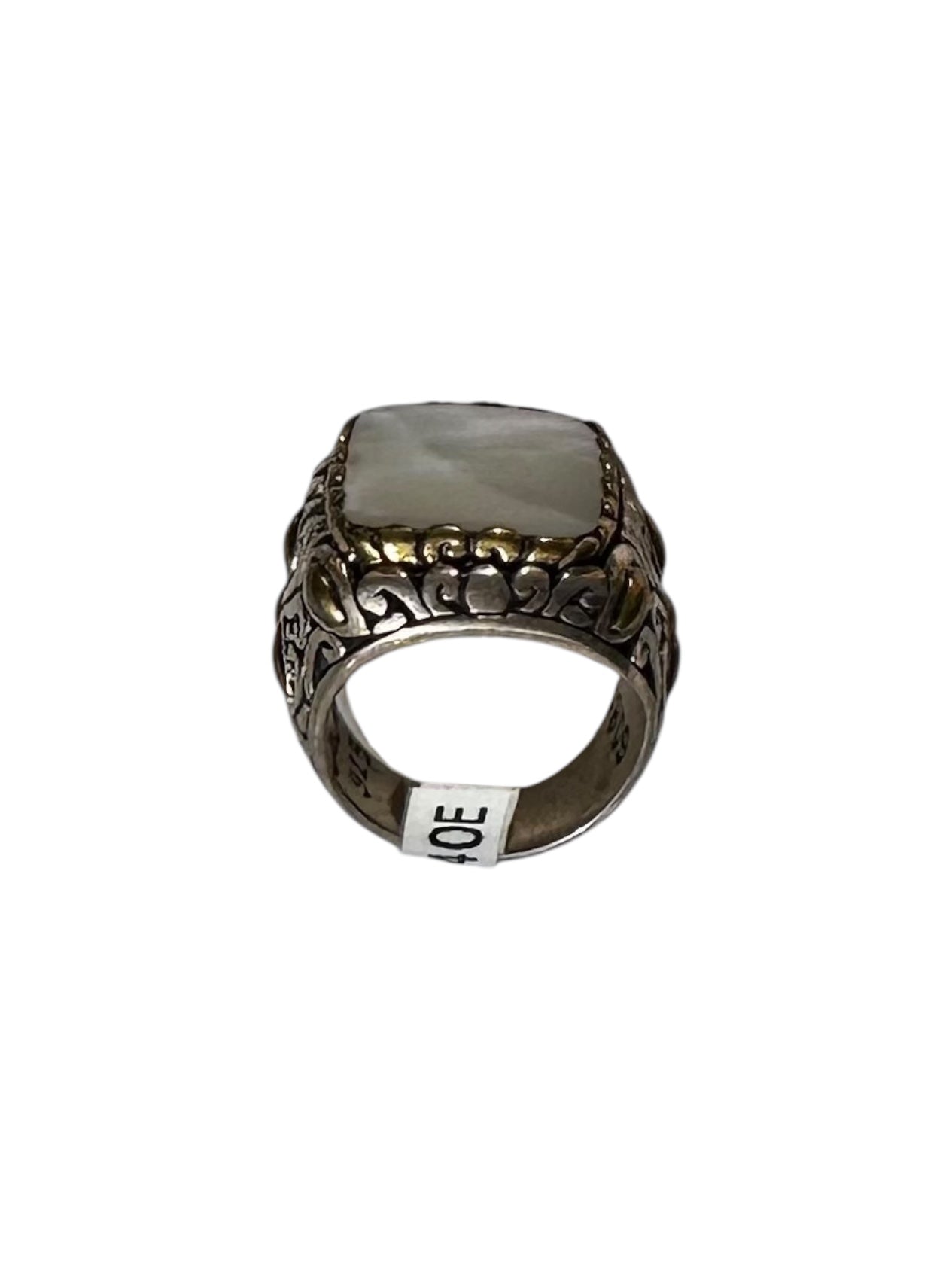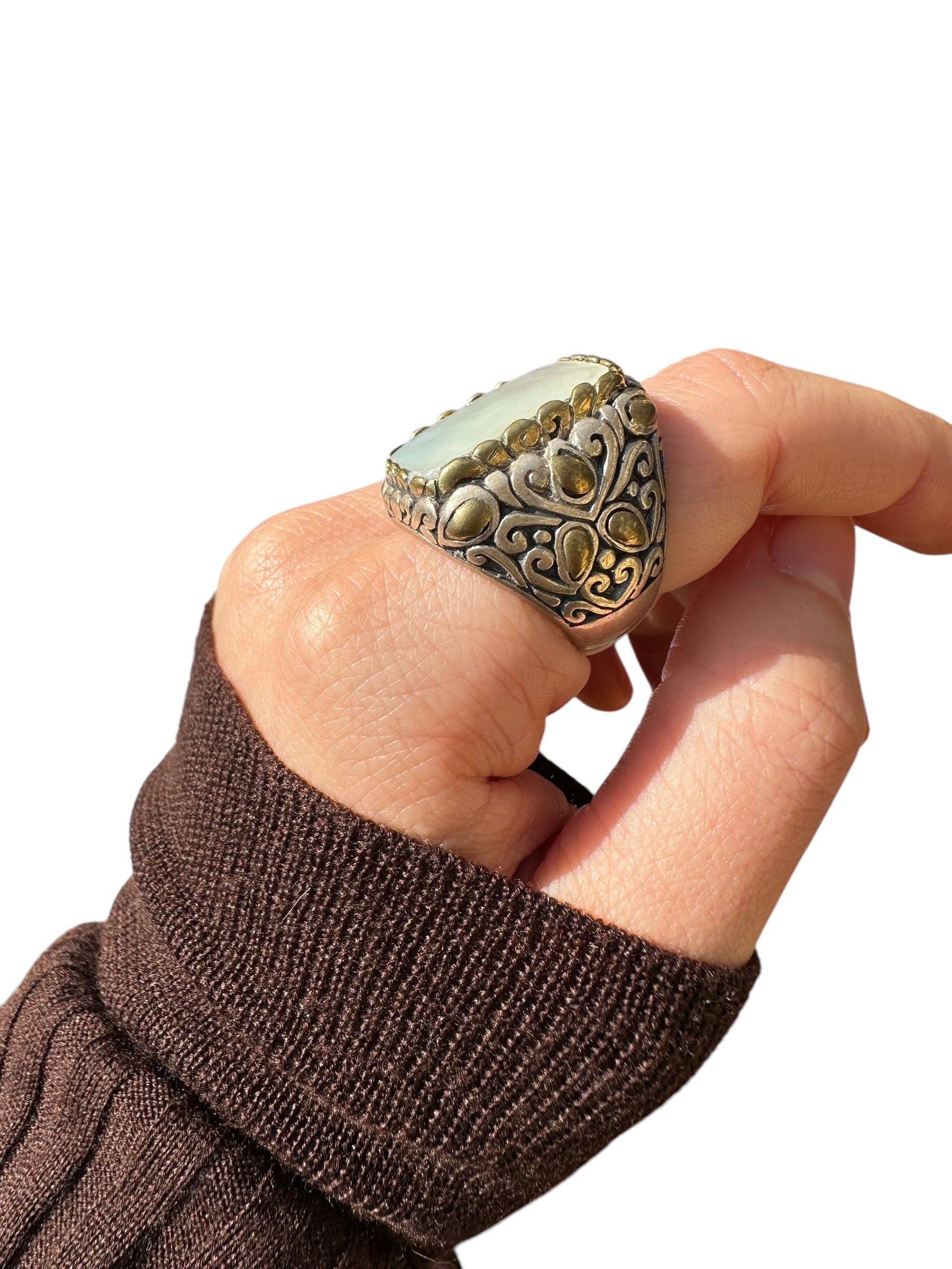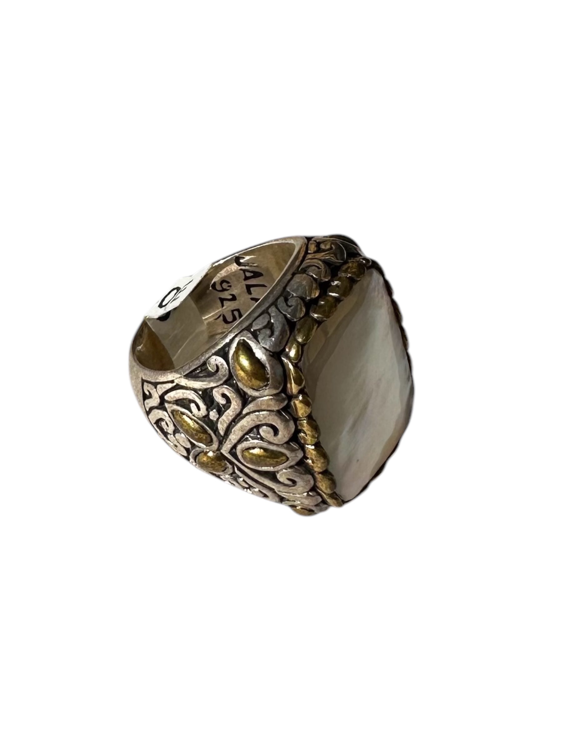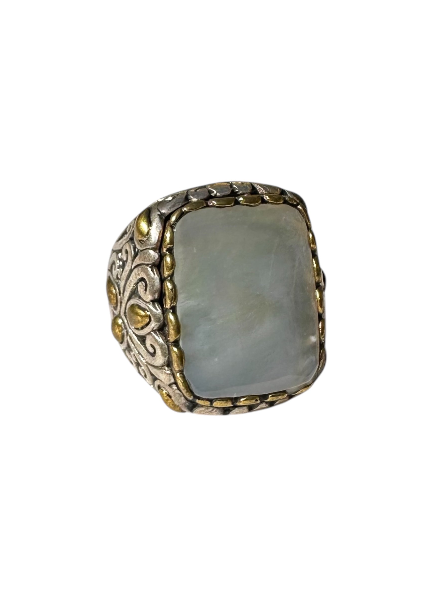 Bague en argent 925 ornée de nacre, sertie de laiton. Ce modèle taille petit du fait de l'épaisseur de la monture, il est donc recommandé de prendre la taille au dessus de votre taille habituelle.