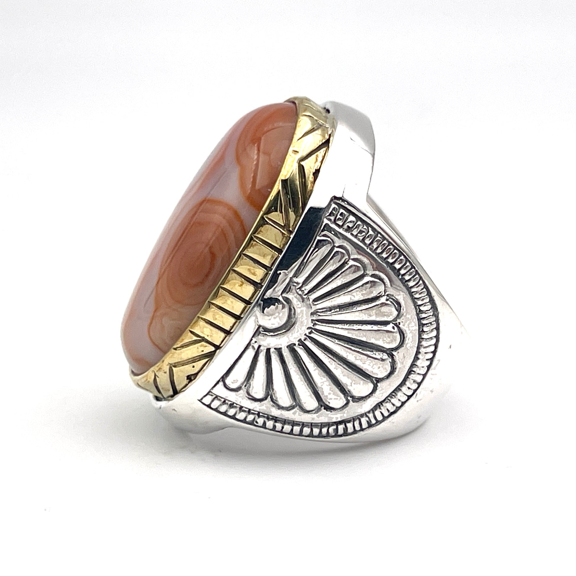 Bague en argent 925 ornée d'une pierre semi-précieuse, sertie de laiton. Ce modèle taille petit du fait de l'épaisseur de la monture, il est donc recommandé de prendre la taille au dessus de votre taille habituelle.