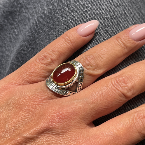 Bague en argent 925 ornée d'une pierre semi-précieuse, sertie de laiton. Ce modèle taille petit du fait de l'épaisseur de la monture, il est donc recommandé de prendre la taille au dessus de votre taille habituelle.