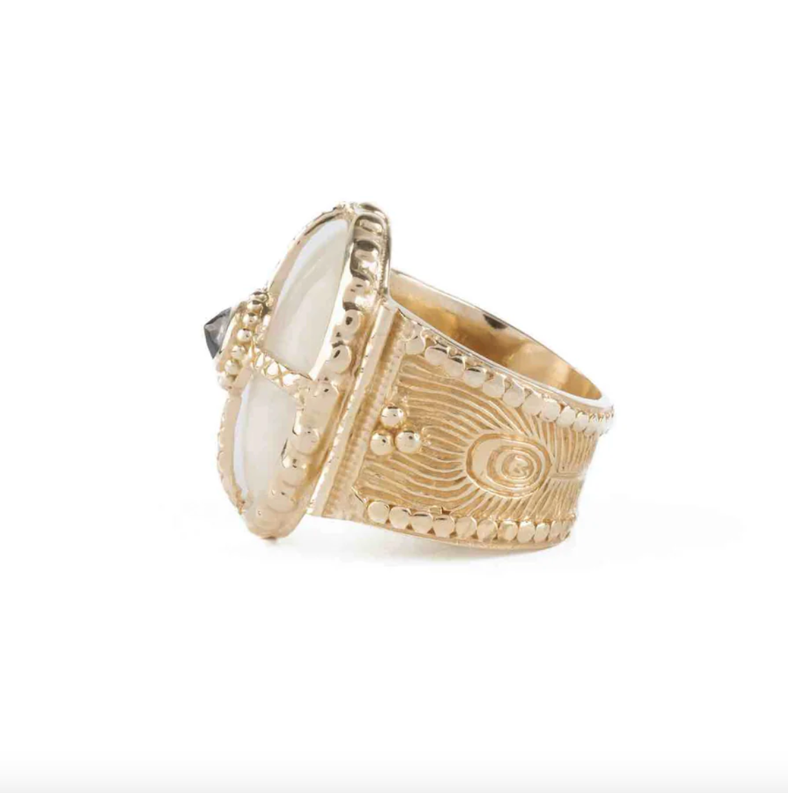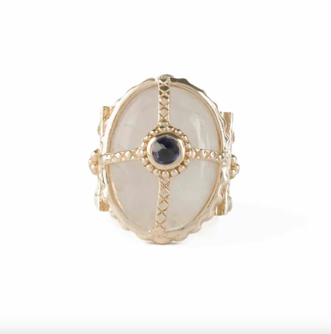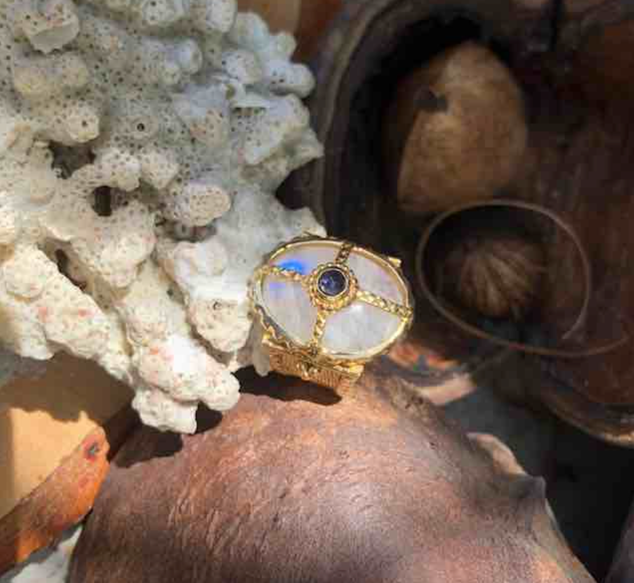 Composition : Pierre de lune, et lolite au centre. Base laiton plaqué or 24 carats, 3 microns.
