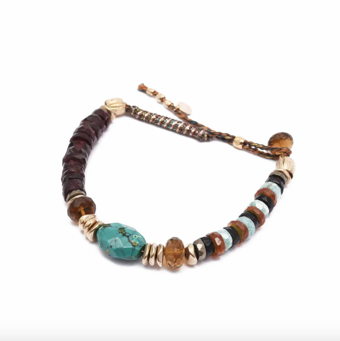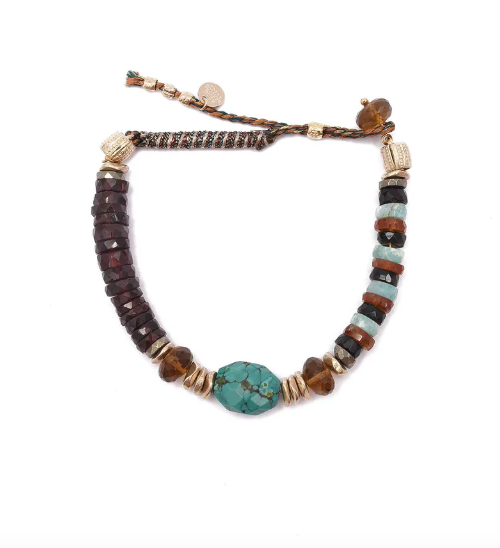 Composition : Spinelle, hessonite, grenat, turquoise, pyrite, amazonite, quartz ambré. Laiton plaqué or 24 carats, 3 microns.