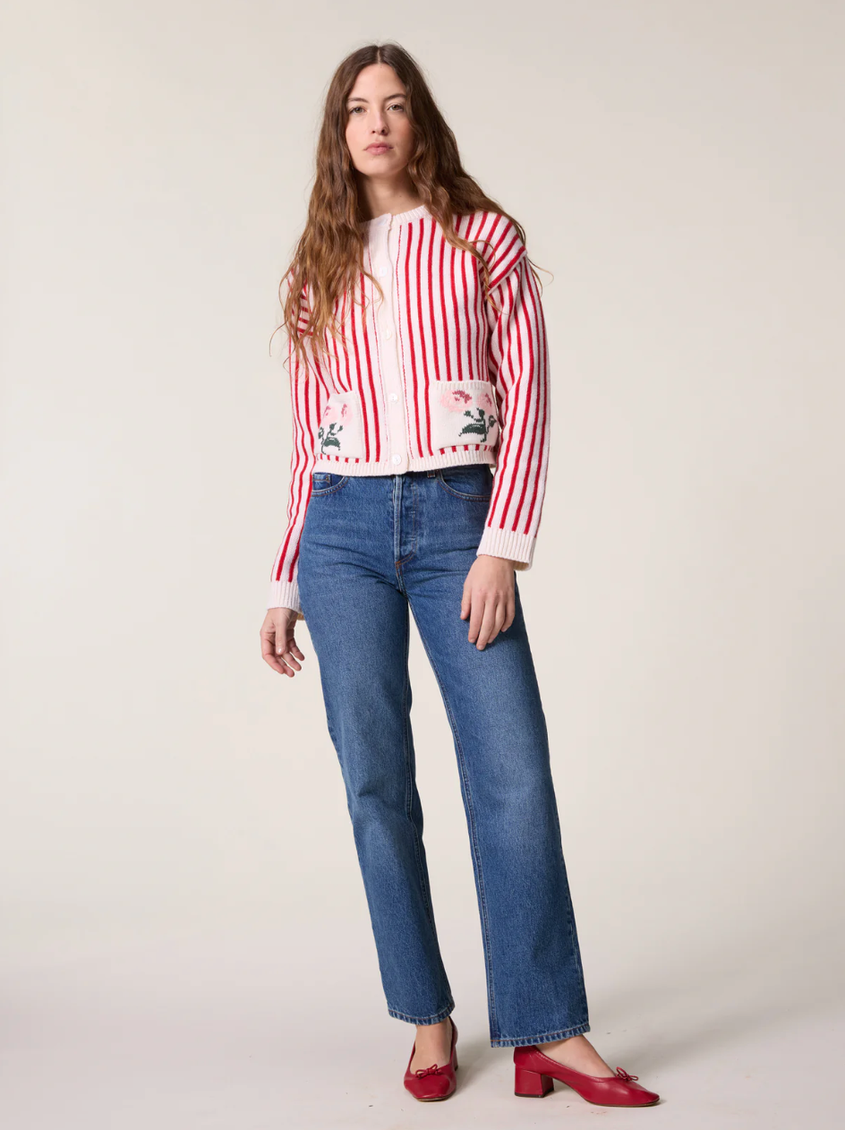 Cardigan style autrichien en laine mélangée. Epaules tombantes, poches plaquées brodées de fleurs, manches longues bord-côte contrastant, boutons nacrés. Taille normalement. Fabriqué en Italie.