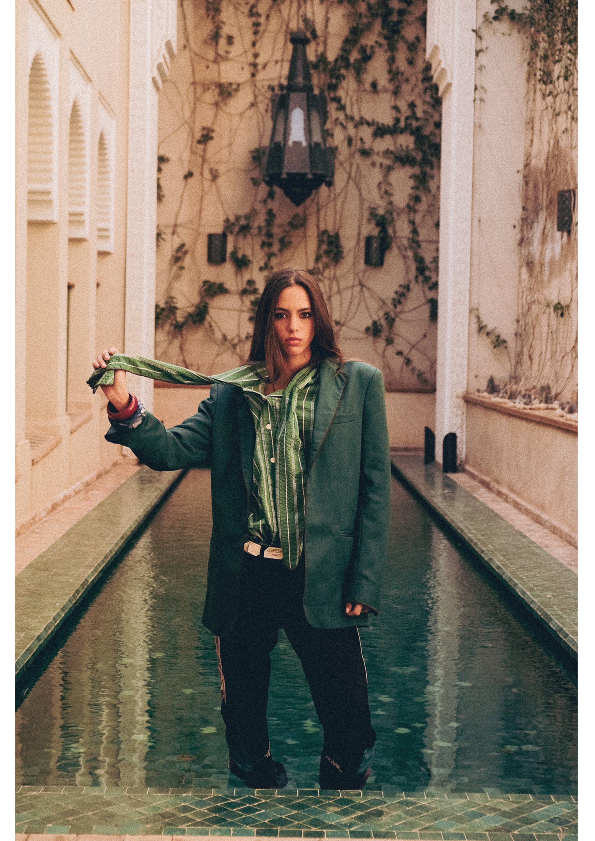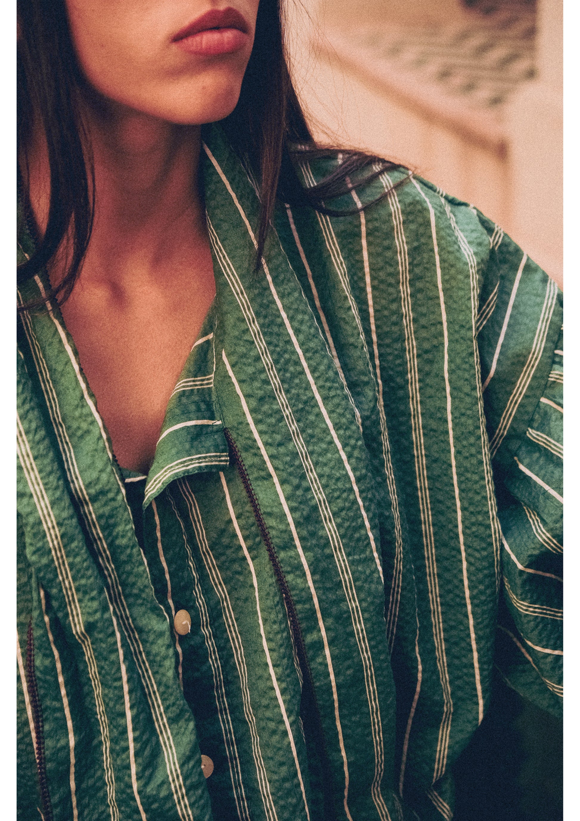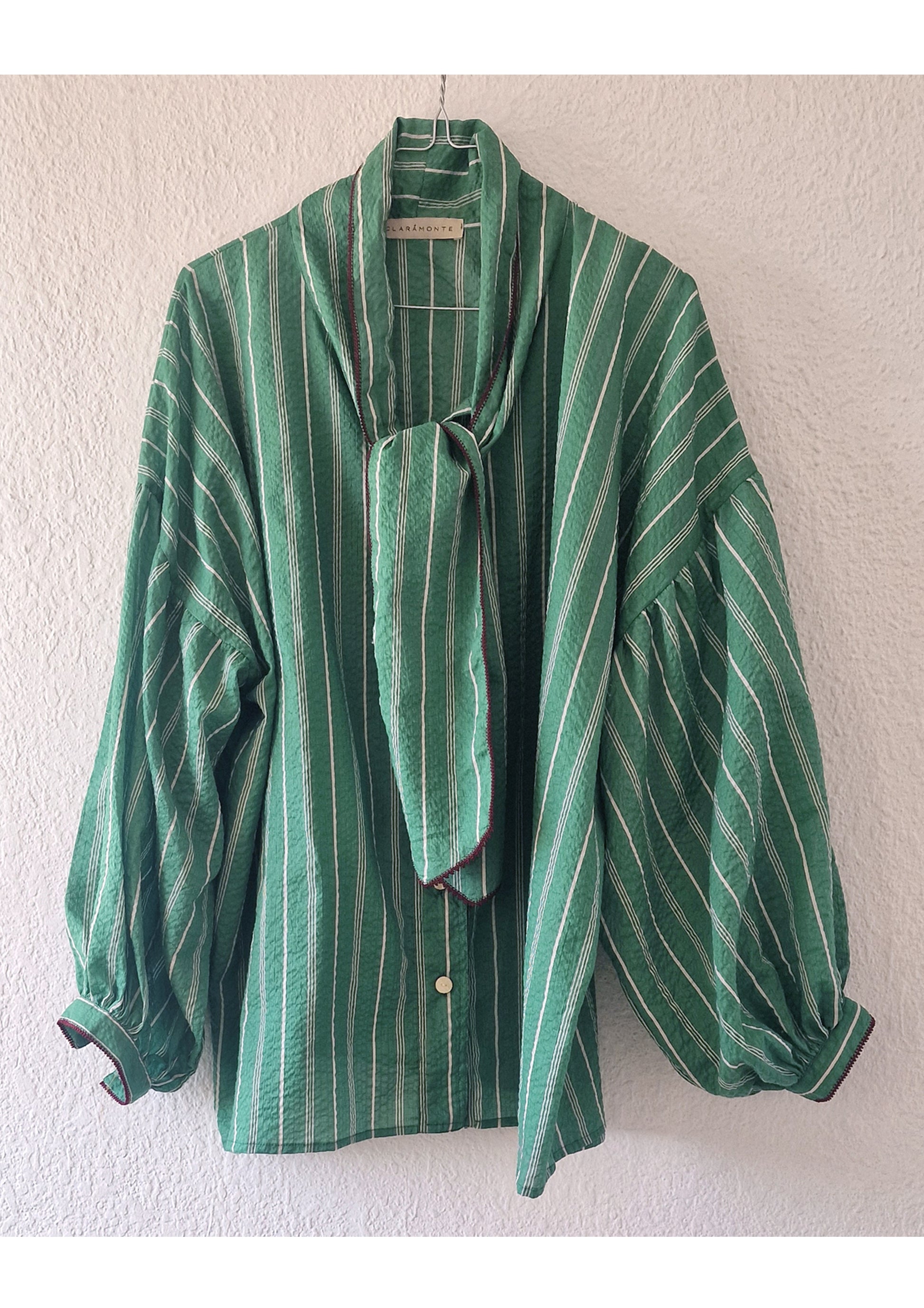 Chemise ample Delice lavalière rayée verte, détails de surpiqures bordeaux.
