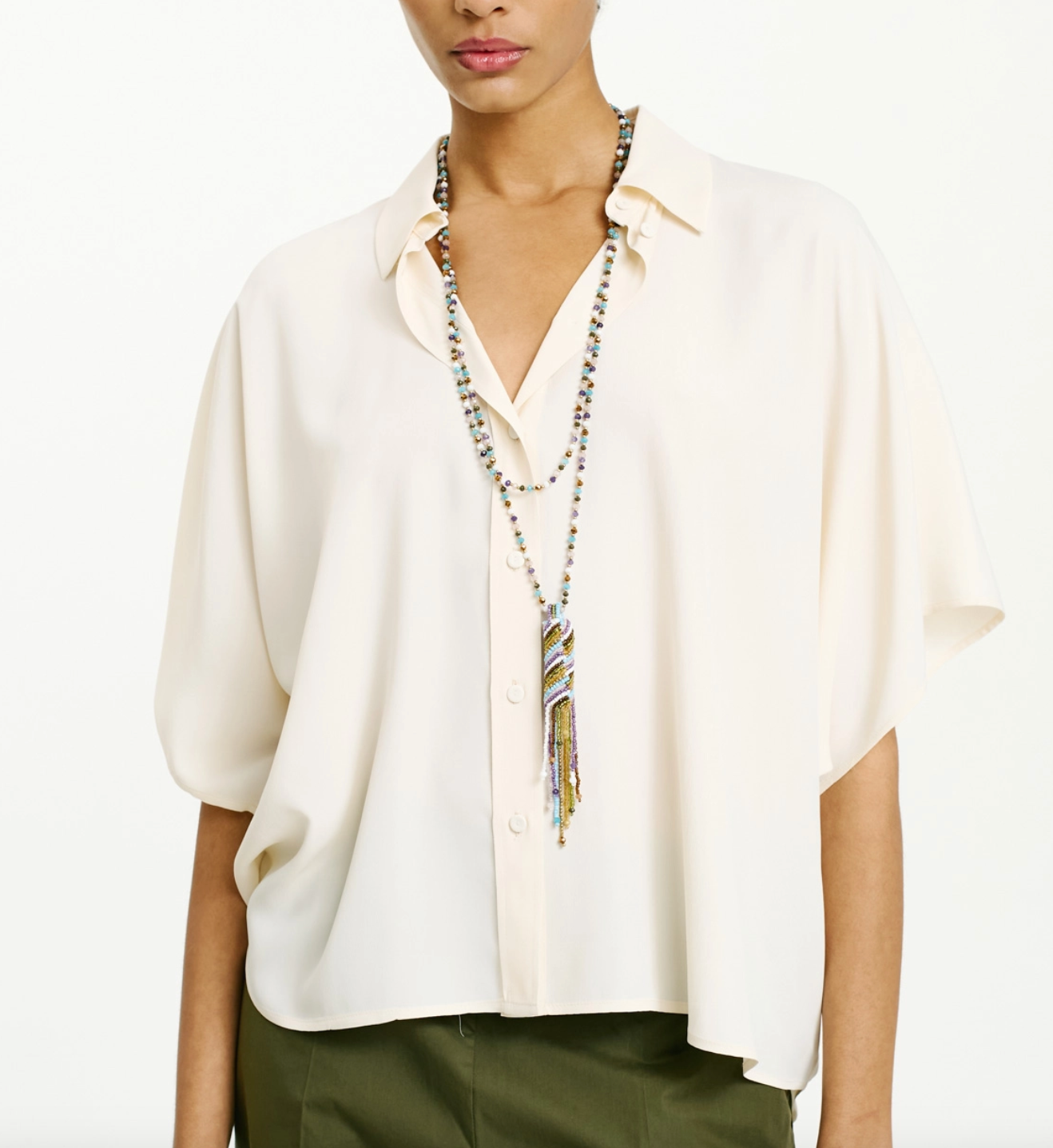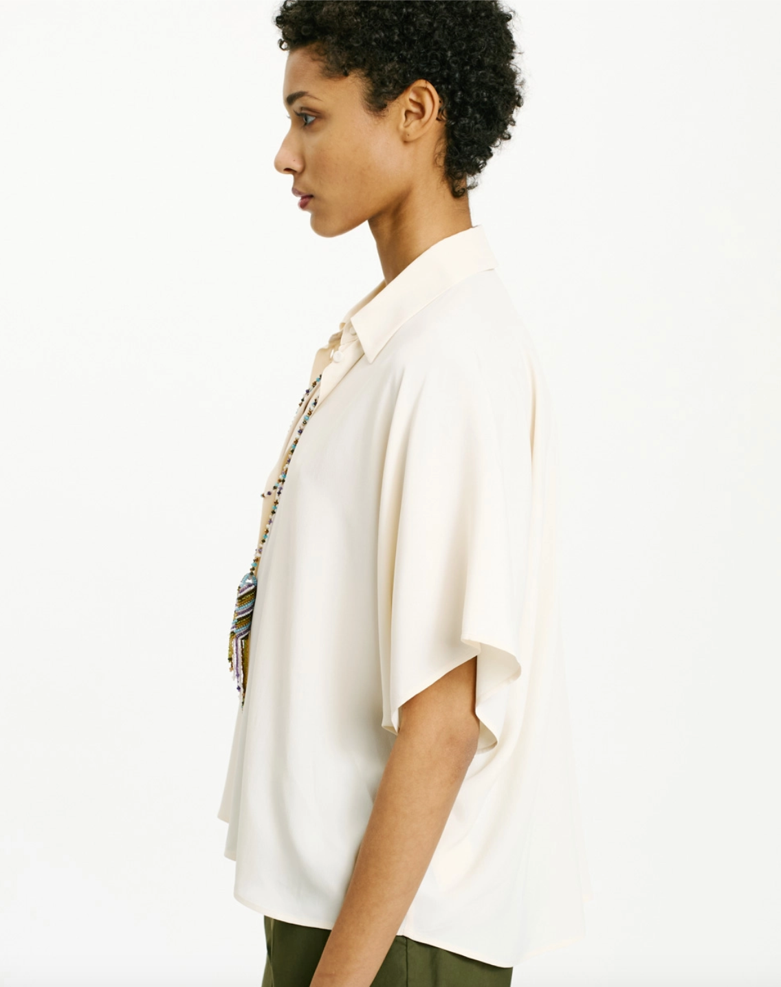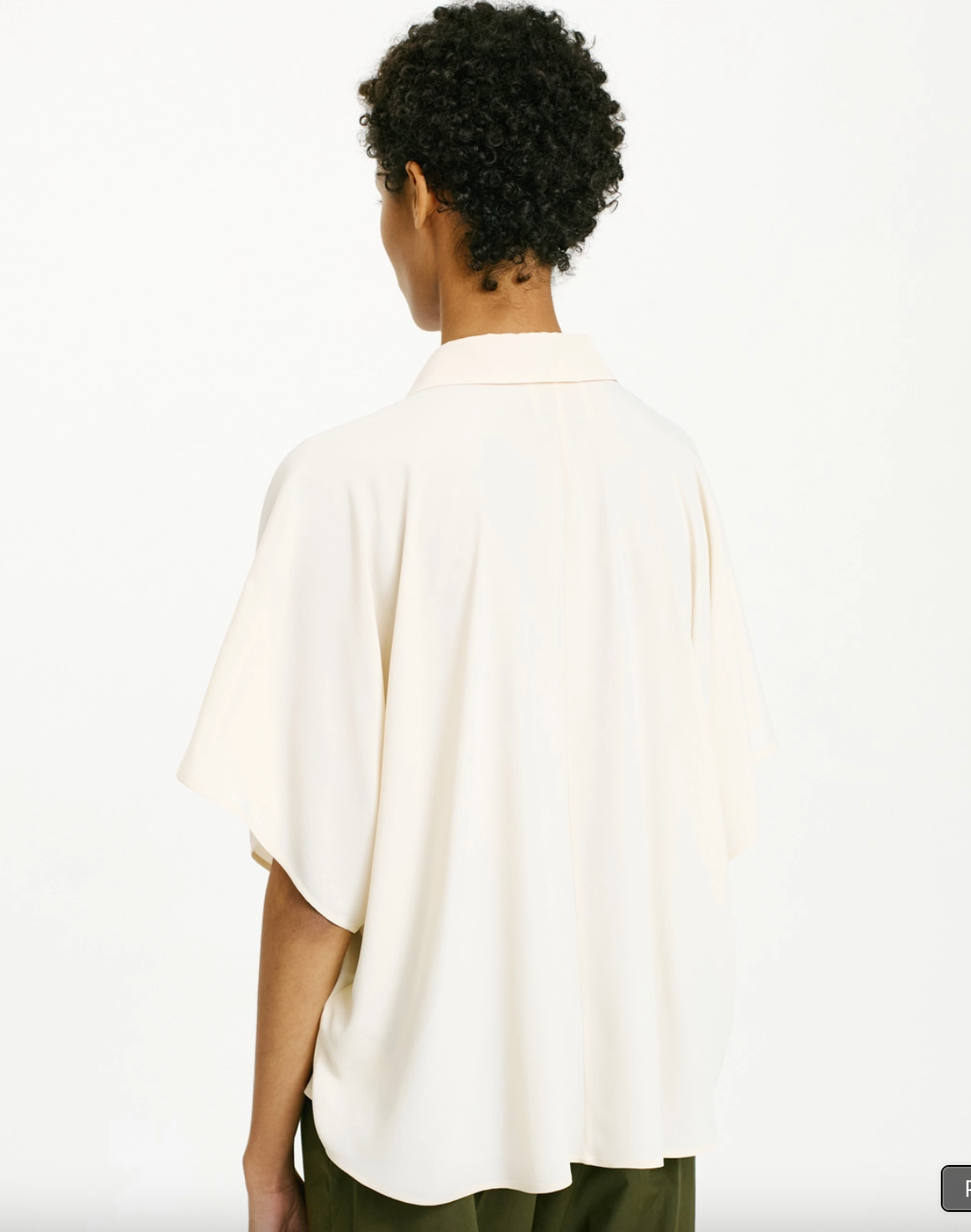 Chemisier Brooklyn, coupe carrée avec manches kimono courtes et petits boutons en nacre. Pièce intemporelle, avec crêpe de soie mélangée qui sublime la coupe fluide de ce vêtement.