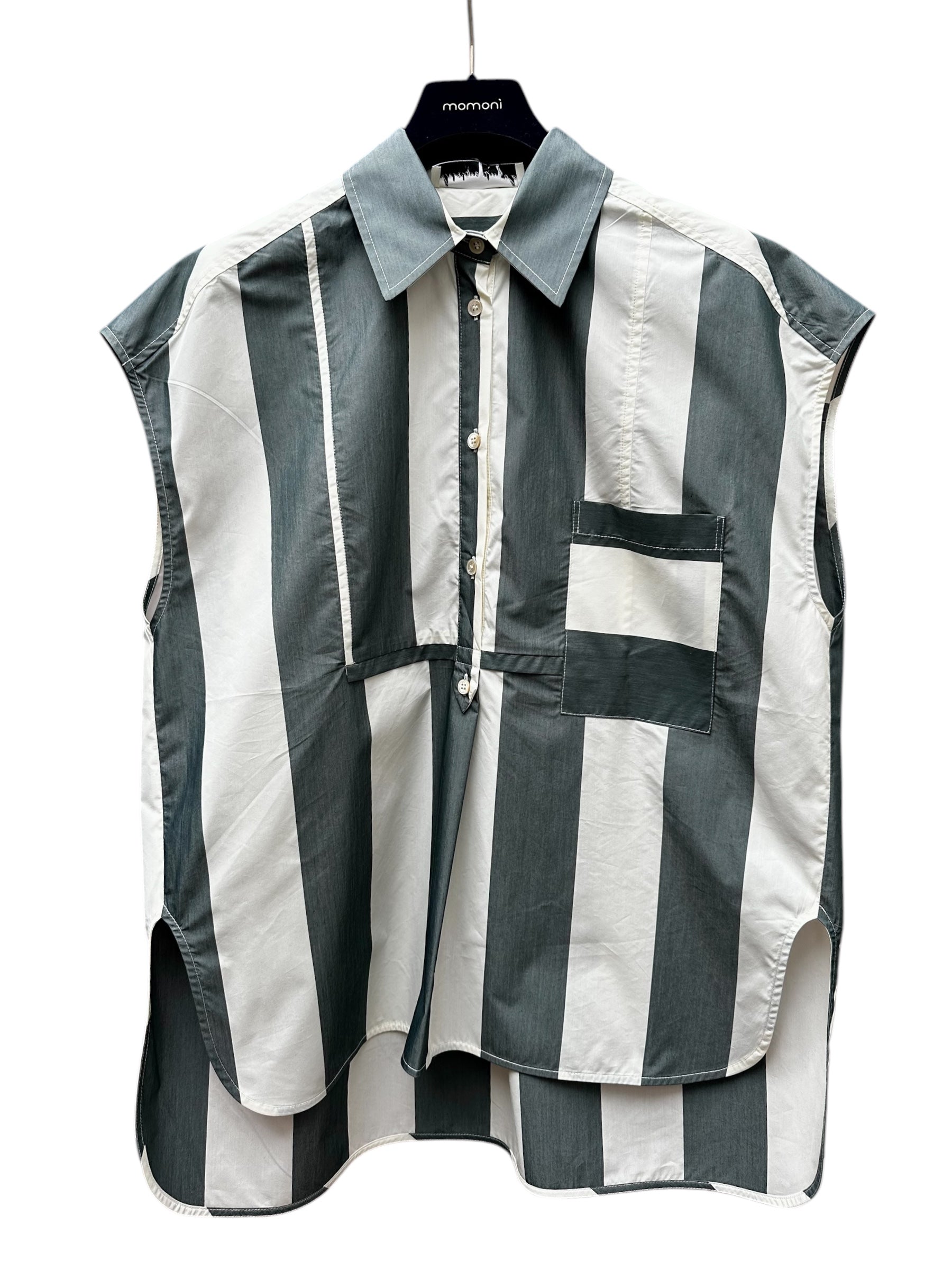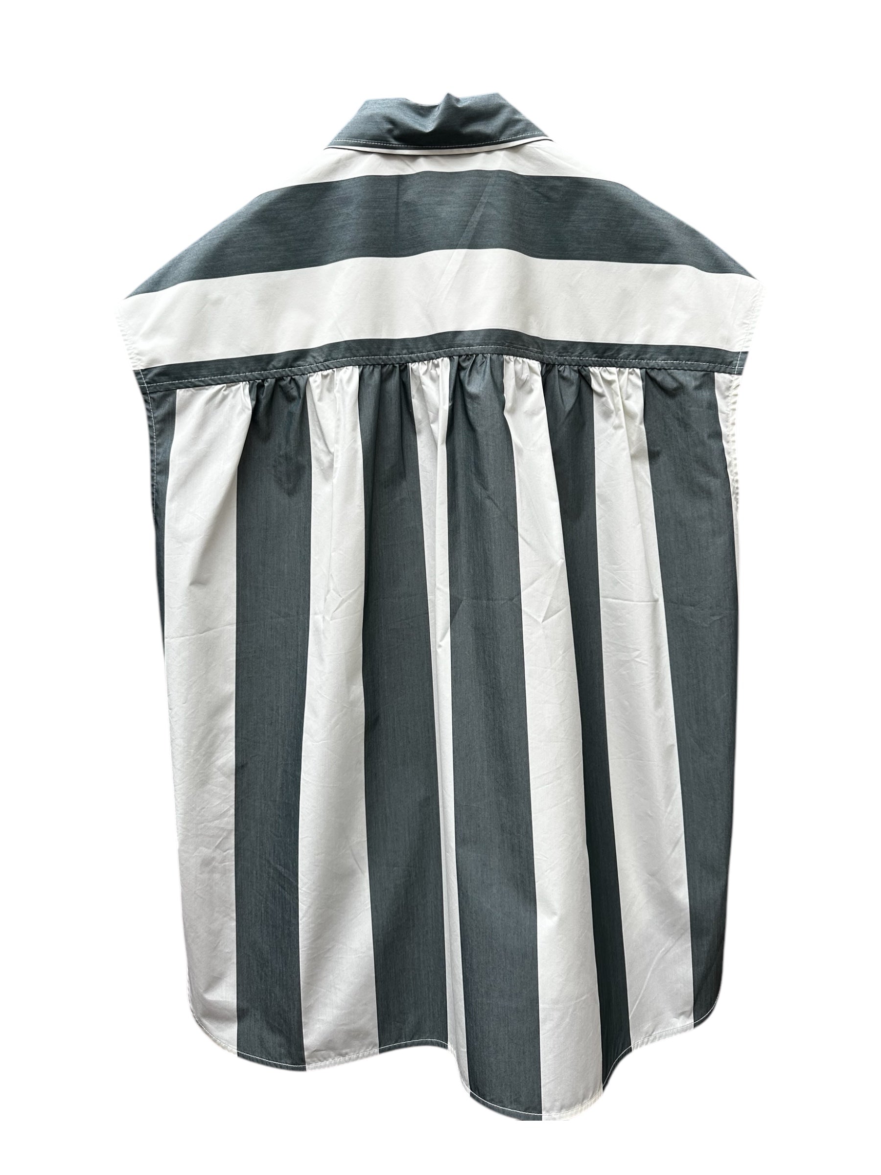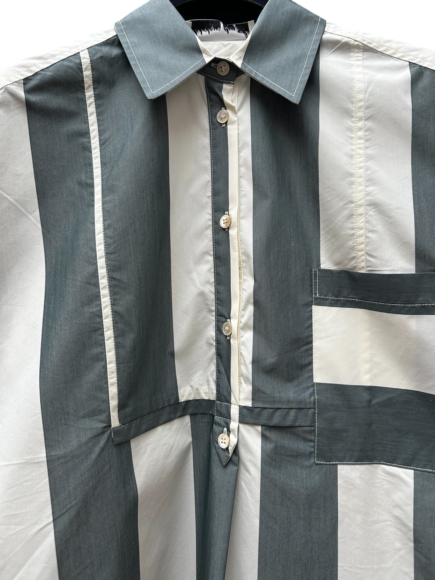 Chemisier PDR à larges rayures ardoises et blanches.Manches courtes, asymétrie de longueur entre l'avant et l'arrière, et une poche à l'avant. Parfait en ensemble avec le pantalon rayé du même thème.