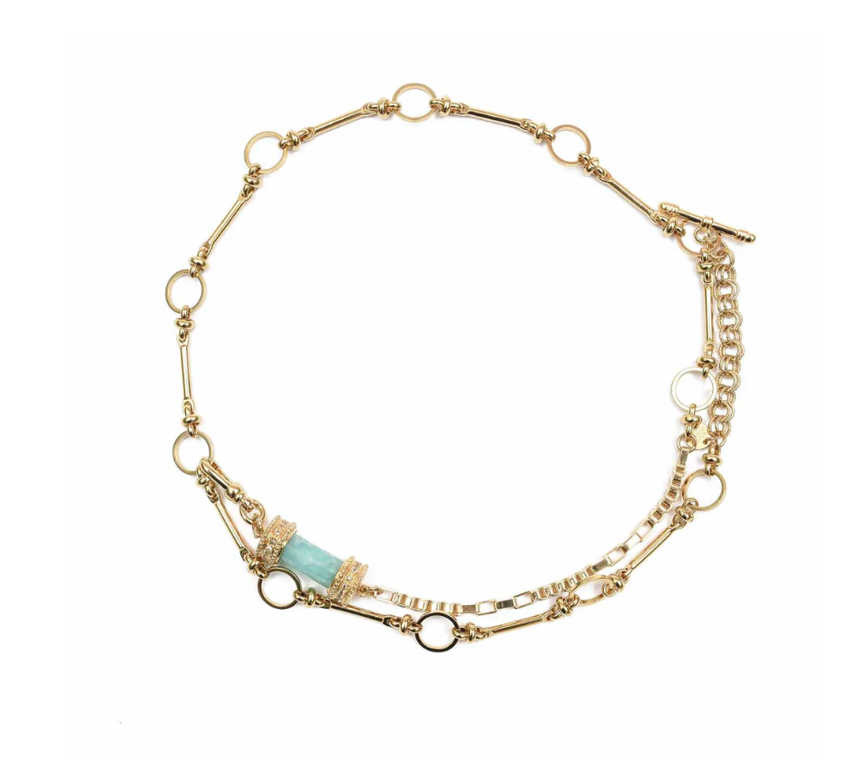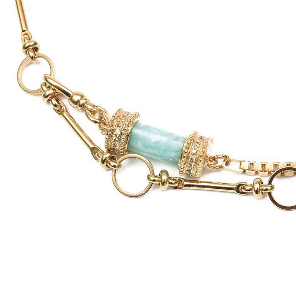 Composition : Amazonite, zircons naturels champagne, laiton plaqué or 24 carats, 3 microns.