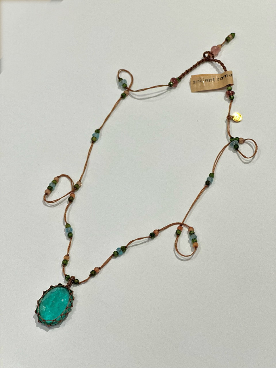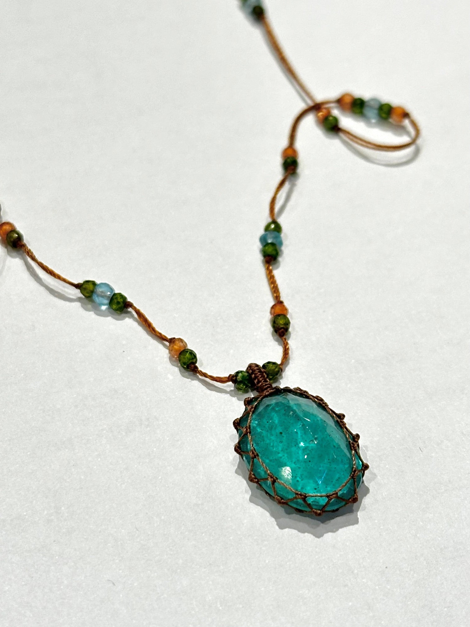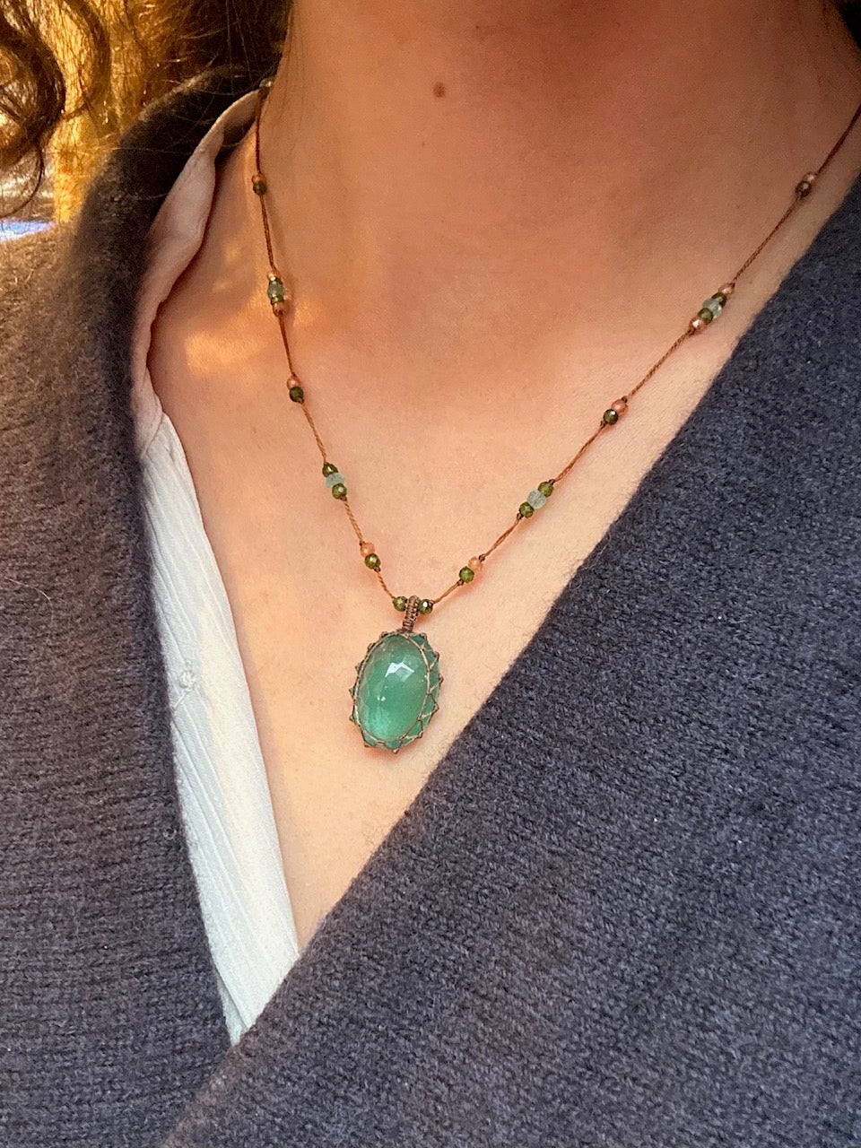 Pierre pendentif rare, sélectionnée pour son caractère exceptionnel, aujourd'hui difficile à trouver dans cette qualité. Cette dernière est montée sur un fil de soie résistant, associé à de petites pierres semi-précieuses le long du collier.