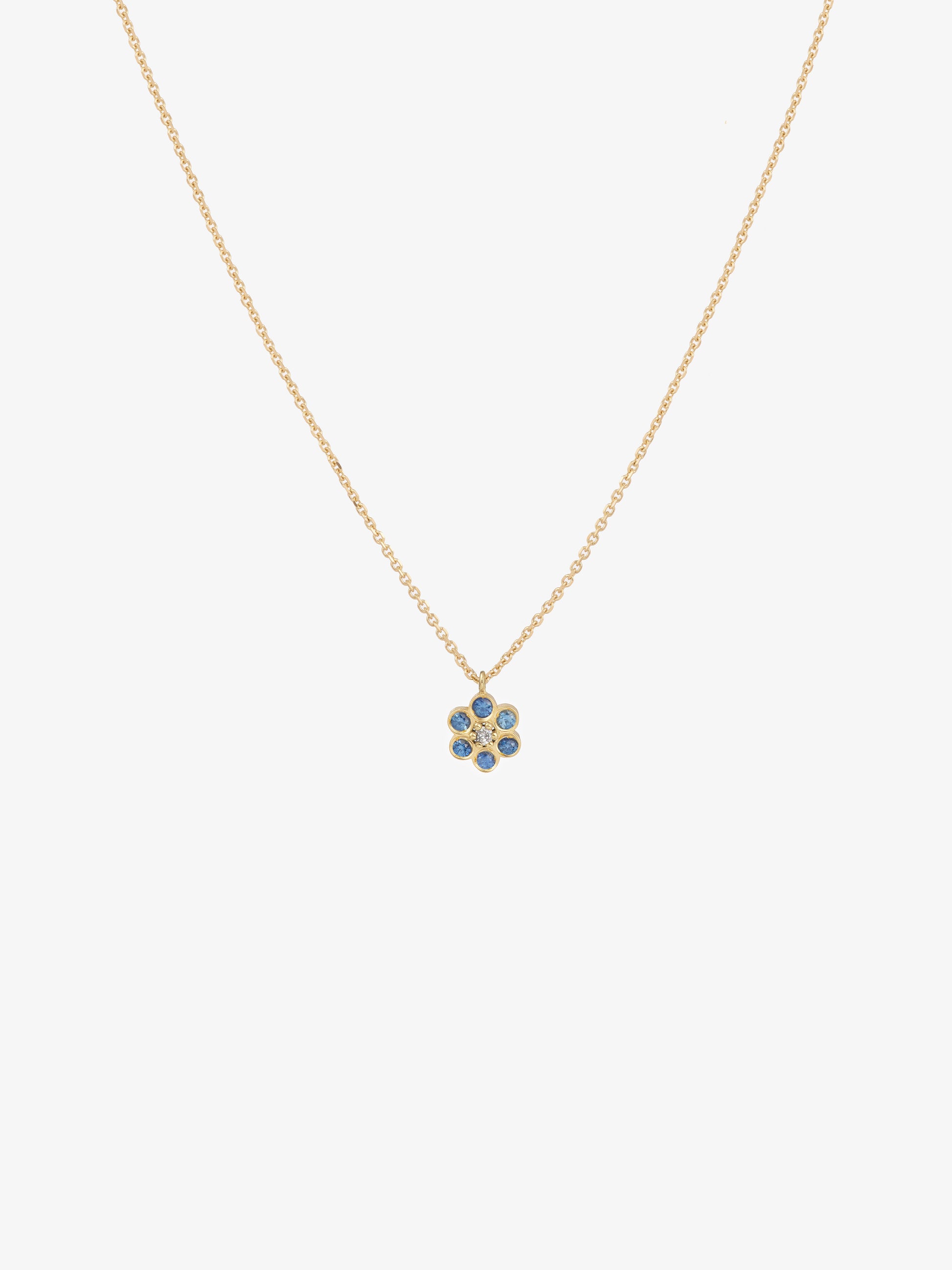 Le délicat collier Miniflower est crée à la main et serti de 7 pierres précieuses : 6 saphirs azur et 1 diamant “Salt & Pepper” pour sublimer le décolleté avec une touche de couleur tout en simplicité. Se marie très bien avec d’autres colliers.