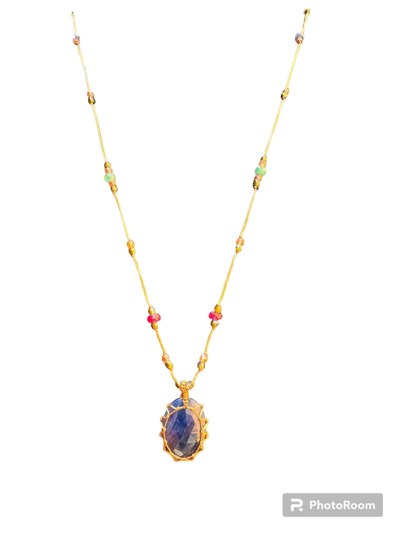 Pierre pendentif Corundum Saphir montée sur un fil beige résistant et associé à des perles de pierres de tourmaline.