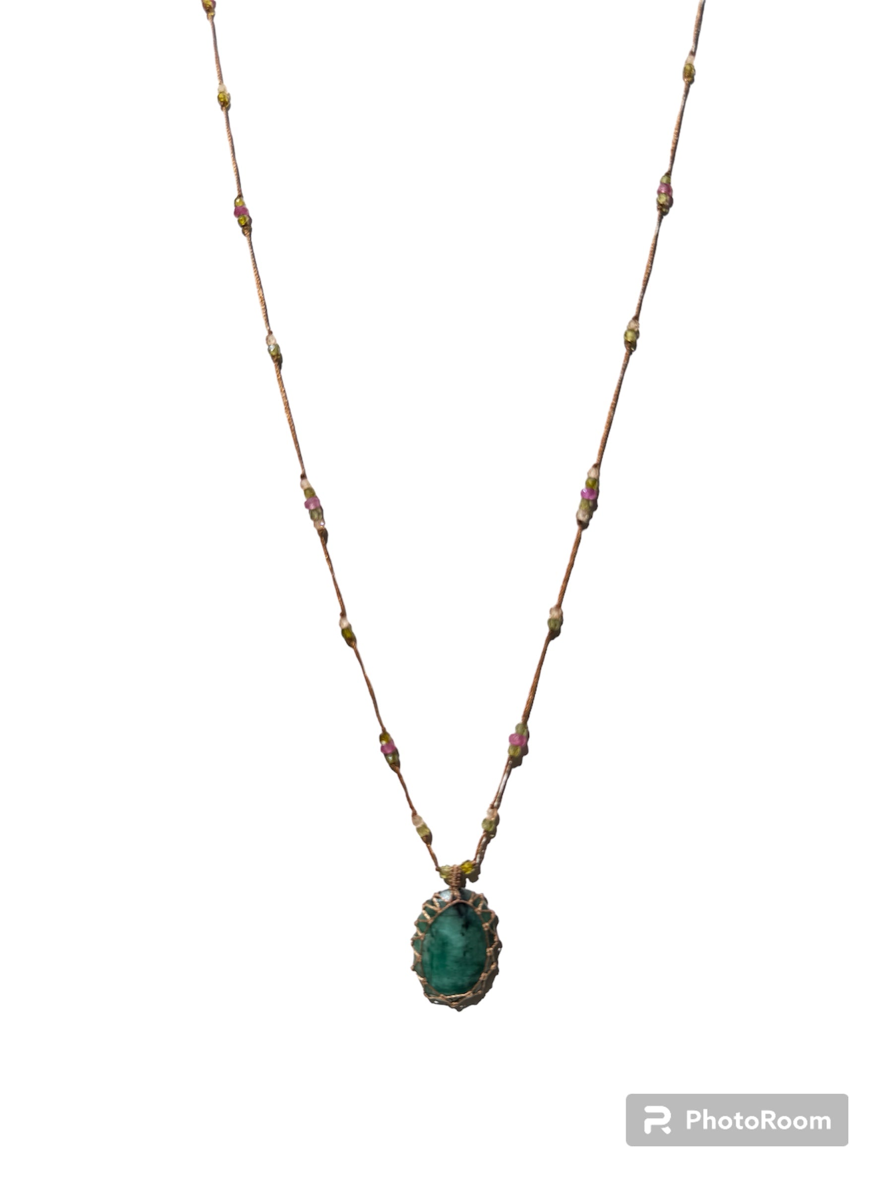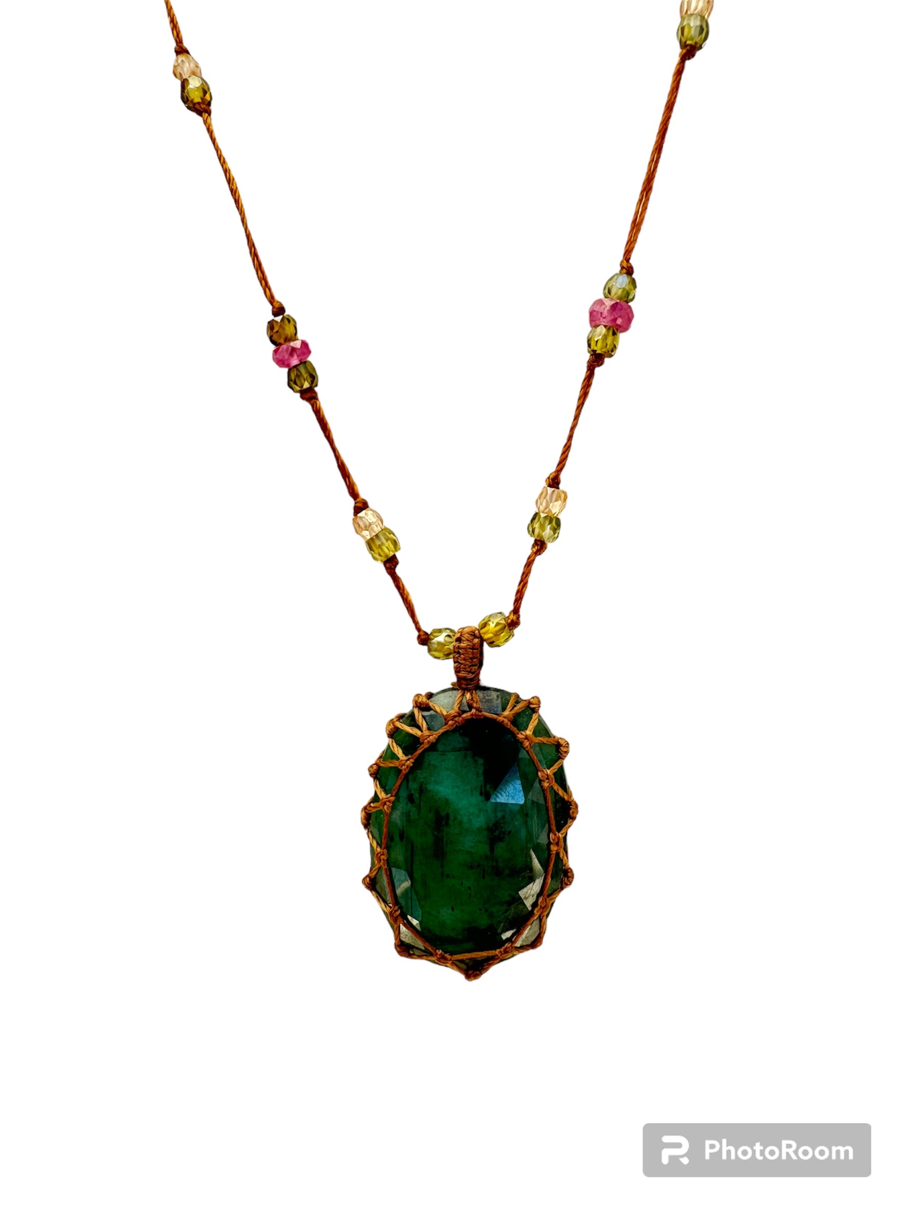 Pierre pendentif Emeraude montée sur un fil beige résistant et associé à des perles de pierres de tourmaline.