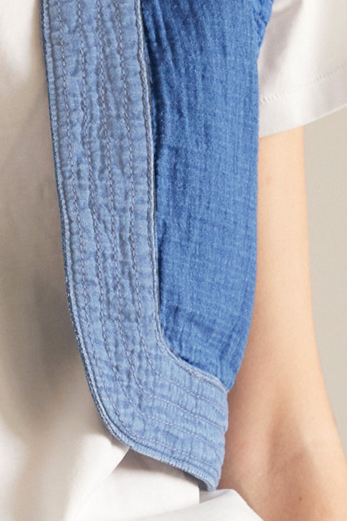 Gilet court bicolore en gaze double étoffe indigo lavée, tissée en Italie.
