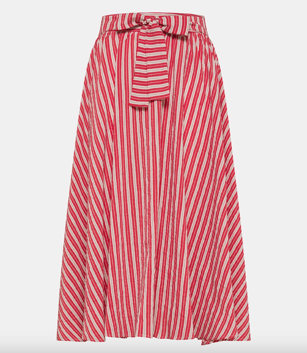Jupe évasée, coupe régulière longueur midi, avec taille froncée et ceinture haute en tissu à nouer. Ouverture zippée latérale. Tissu rayé rouge et crème.