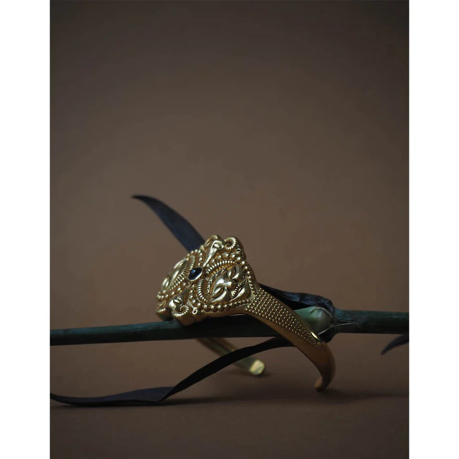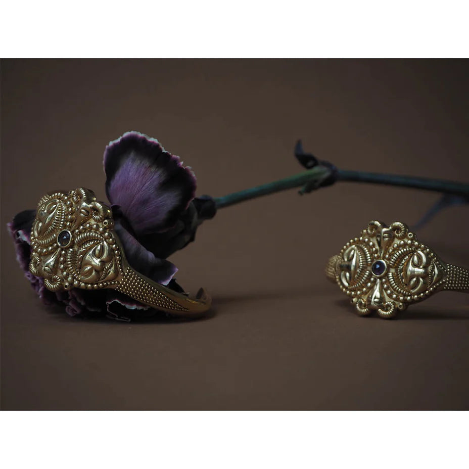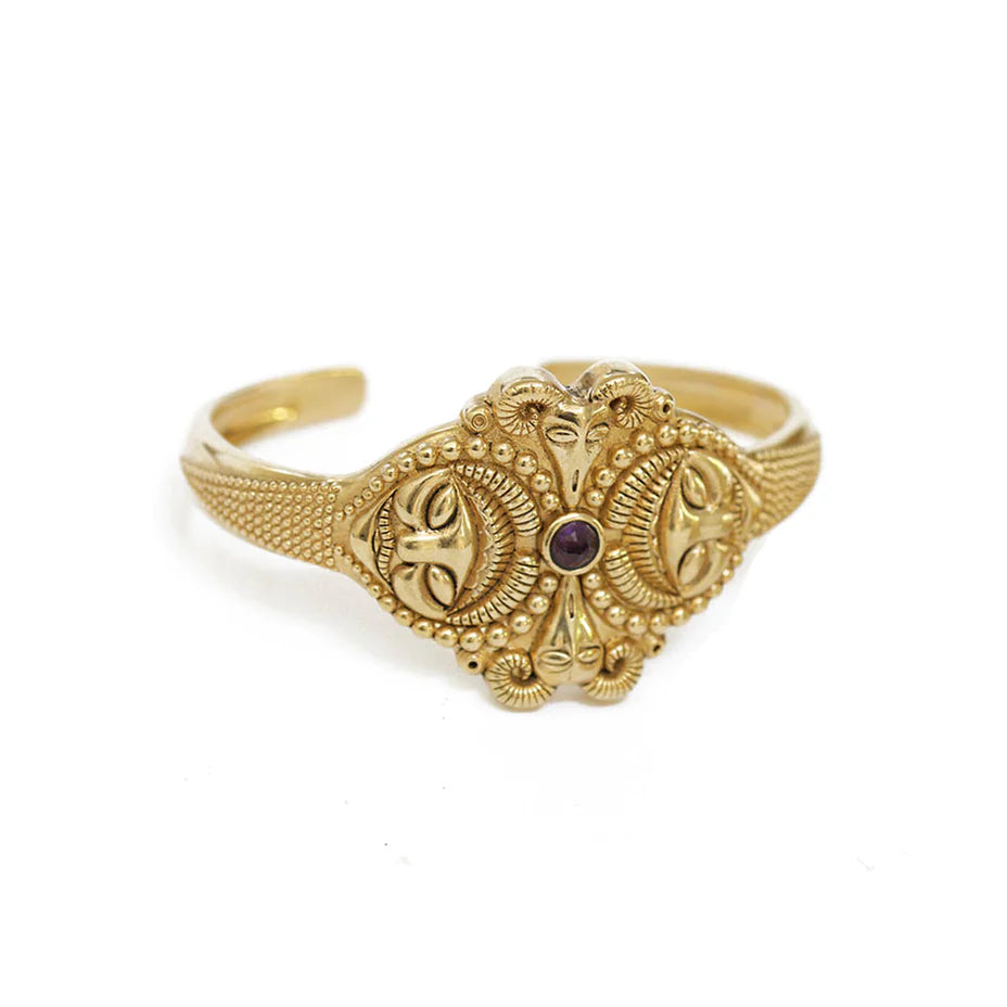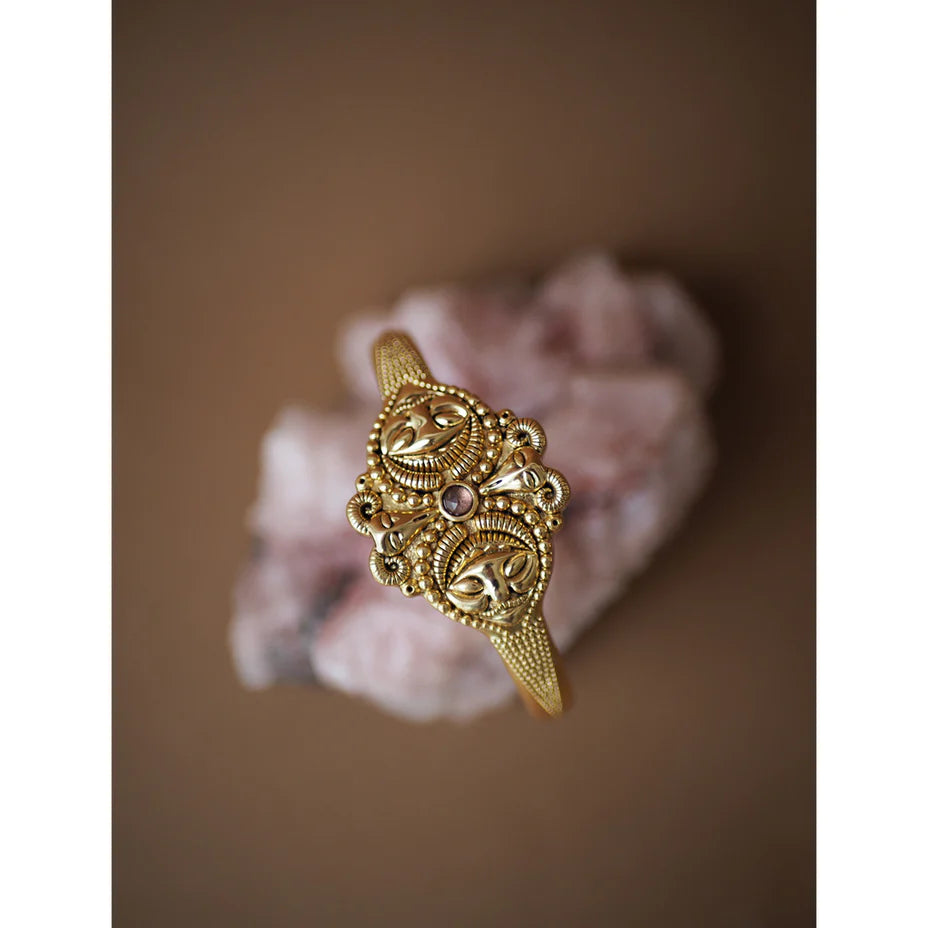 La Manchette Aya Bélier est un bracelet élégant en laiton bain d'or, orné d'une magnifique pierre semi-précieuse améthyste. Avec une largeur de 3 cm et un modèle ajustable, cette manchette est confortable et élégante pour toutes les occasions.